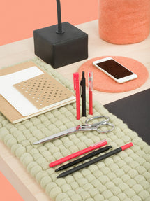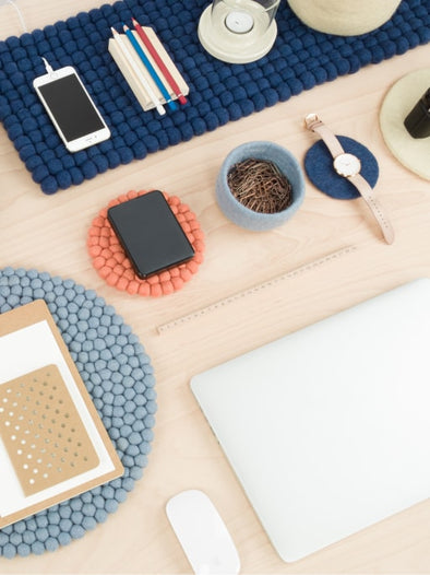 Ein schöner und aufgeräumter Arbeitsplatz fördert die Konzentration. Denn in einer geordneten Umgebung lässt es sich effektiver und angenehmer arbeiten. Als kleine Ordnungshelfer kommen die Filzkörbe und Untersetzer von myfelt zum Einsatz. Ihre robuste und weiche Struktur verleihen dem Arbeitszimmer eine besondere Atmosphäre. Die Filzkörbe in unterschiedlichen Größen und Farben schaffen nicht nur auf dem Schreibtisch Ordnung, sondern machen auch auf Sideboards, Regalen und Beistelltischen eine gute Figur. Handys, Headphones, Stifte und weitere Arbeitsmaterialien liegen auf den Untersetzern griffbereit.