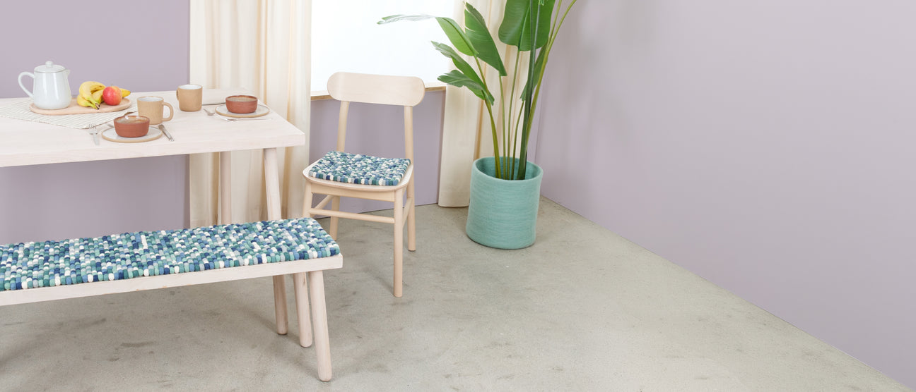 Mit den komfortablen Sitzauflagen von myfelt lassen sich Stühle und Sitzgelegenheiten nachhaltig aufwerten. Sowohl flach als auch im ansprechenden Filzkugeldesign sind sie sie eine praktische Ergänzung im Esszimmer. Denn wie auch bei allen anderen myfelt Produkten entsprechen Design und Verarbeitung höchsten Standards.