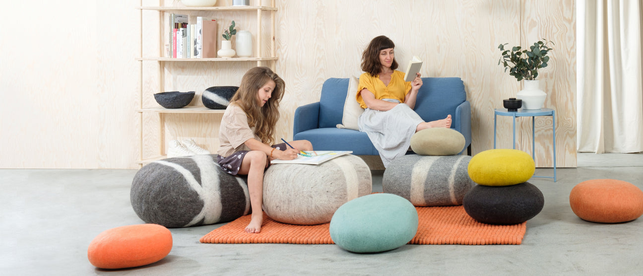 Die unifarbenen myfelt Poufs und die realistisch anmutenden Filzkieselsteine eignen sich nicht nur ideal als hochwertige Deko-Elemente im Wohnraum. Auch als bequeme und naturbelassene Sitzkissen oder als weicher Hocker für autogenes Training, Yoga und Meditation sind sie beliebt und in verschiedenen Größen erhältlich.
