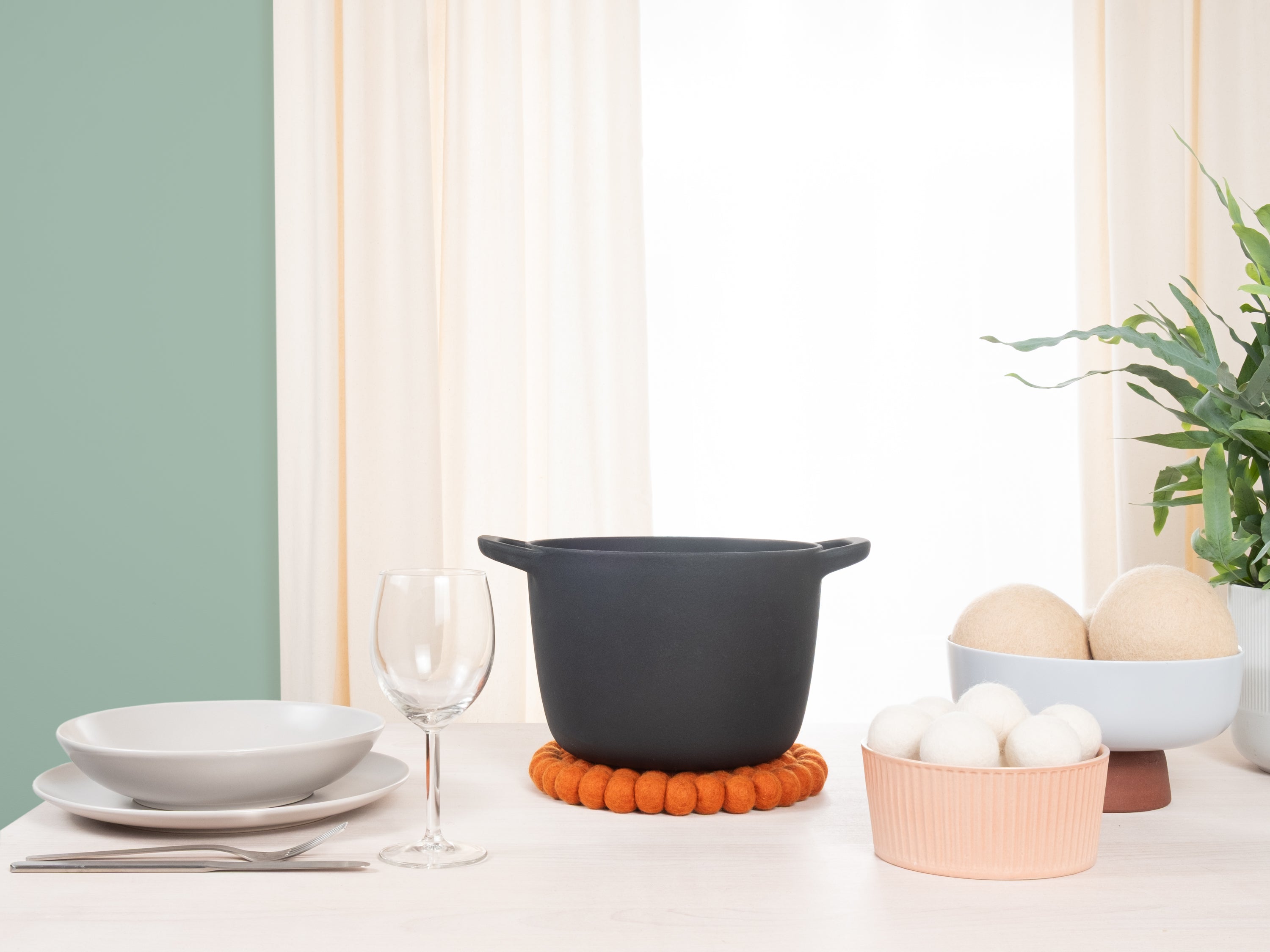 Der Topfuntersetzer Afra in der Farbe Orange verbindet Funktion mit charmanter Optik. Robust, hitzebeständig, wasser- und schmutzabweisend sowie beidseitig verwendbar. Gefertigt aus reiner Schurwolle, von Hand in Nepal hergestellt und unter fairen Bedingungen produziert.