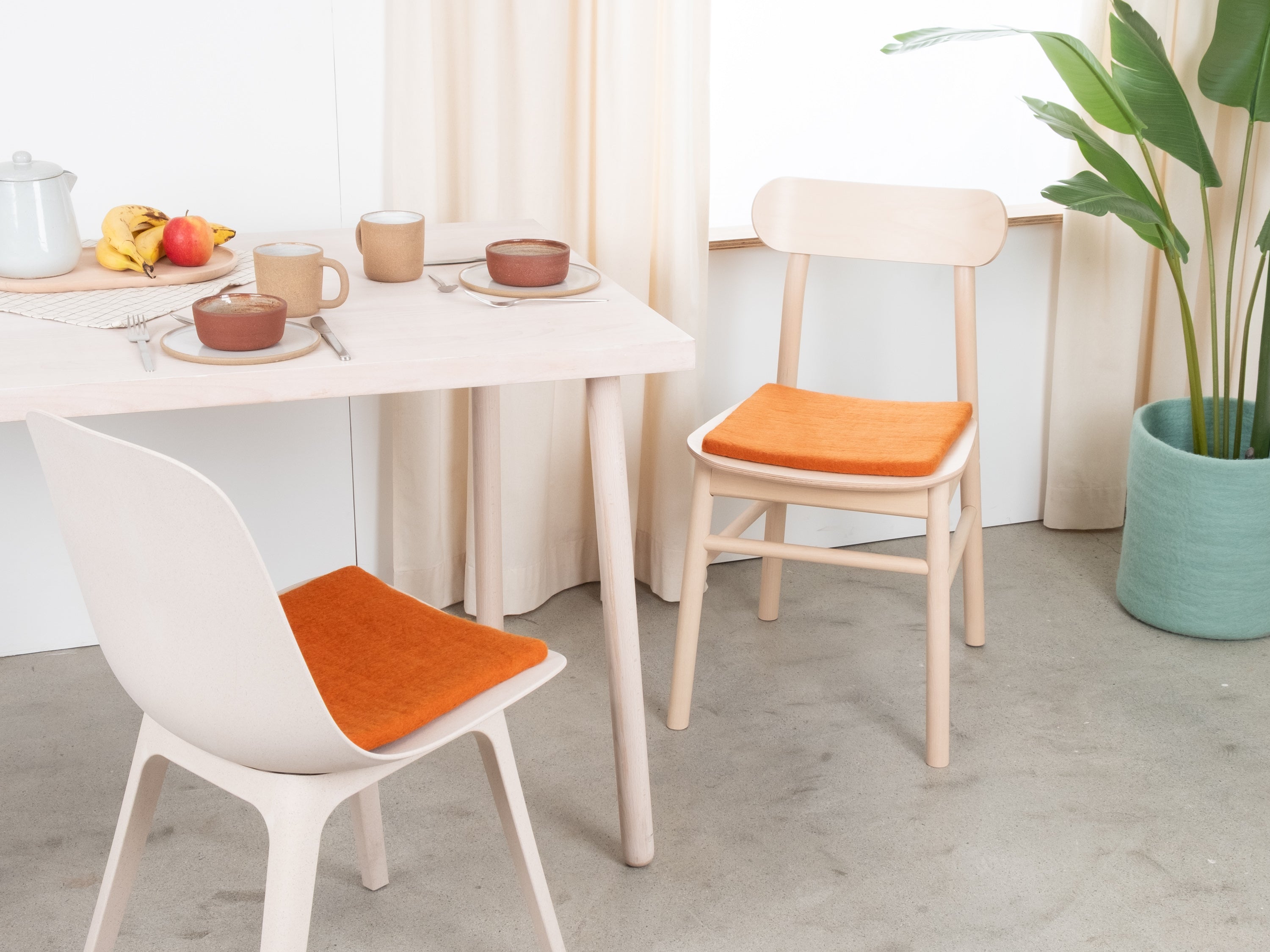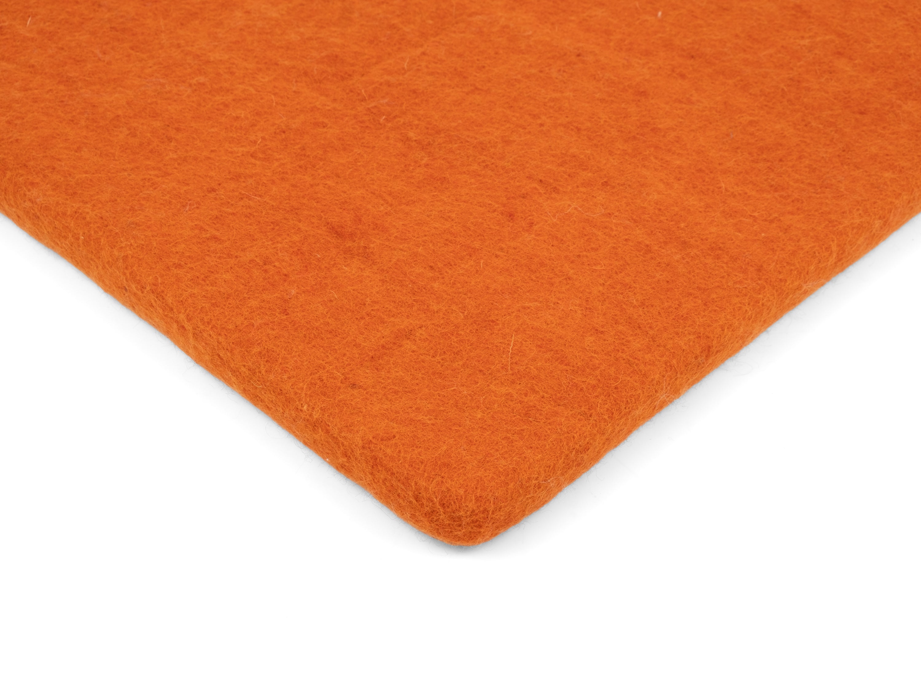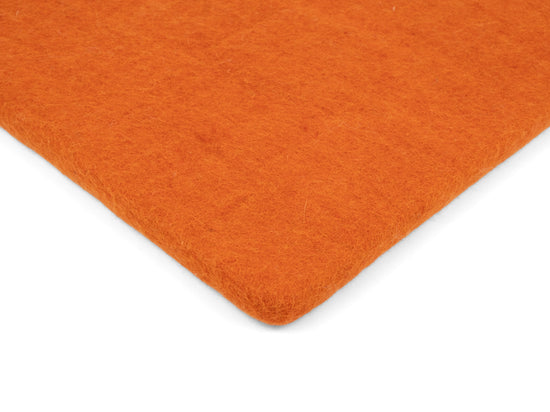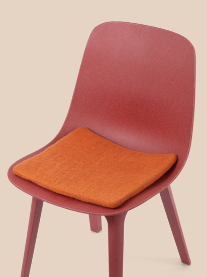 Quadratische, orangefarbene flache Sitzauflage aus reiner Schurwolle.