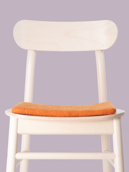 Die orangefarbene, flache Sitzauflage Afra bringt Wärme und Weichheit auf deinen Lieblingsstuhl. Gefertigt aus reiner Schurwolle, von Hand in Nepal hergestellt und unter fairen Bedingungen produziert. myfelt Sitzauflagen sind wasser- und schmutzabweisend und beidseitig verwendbar.