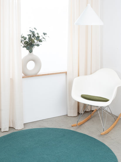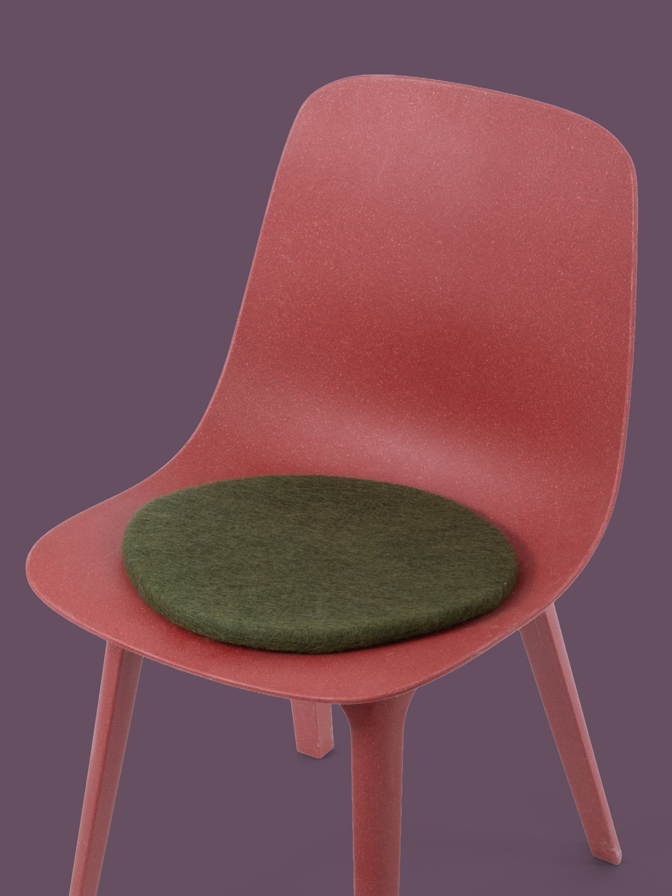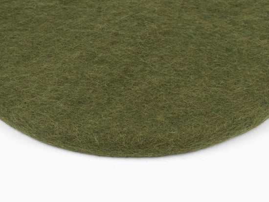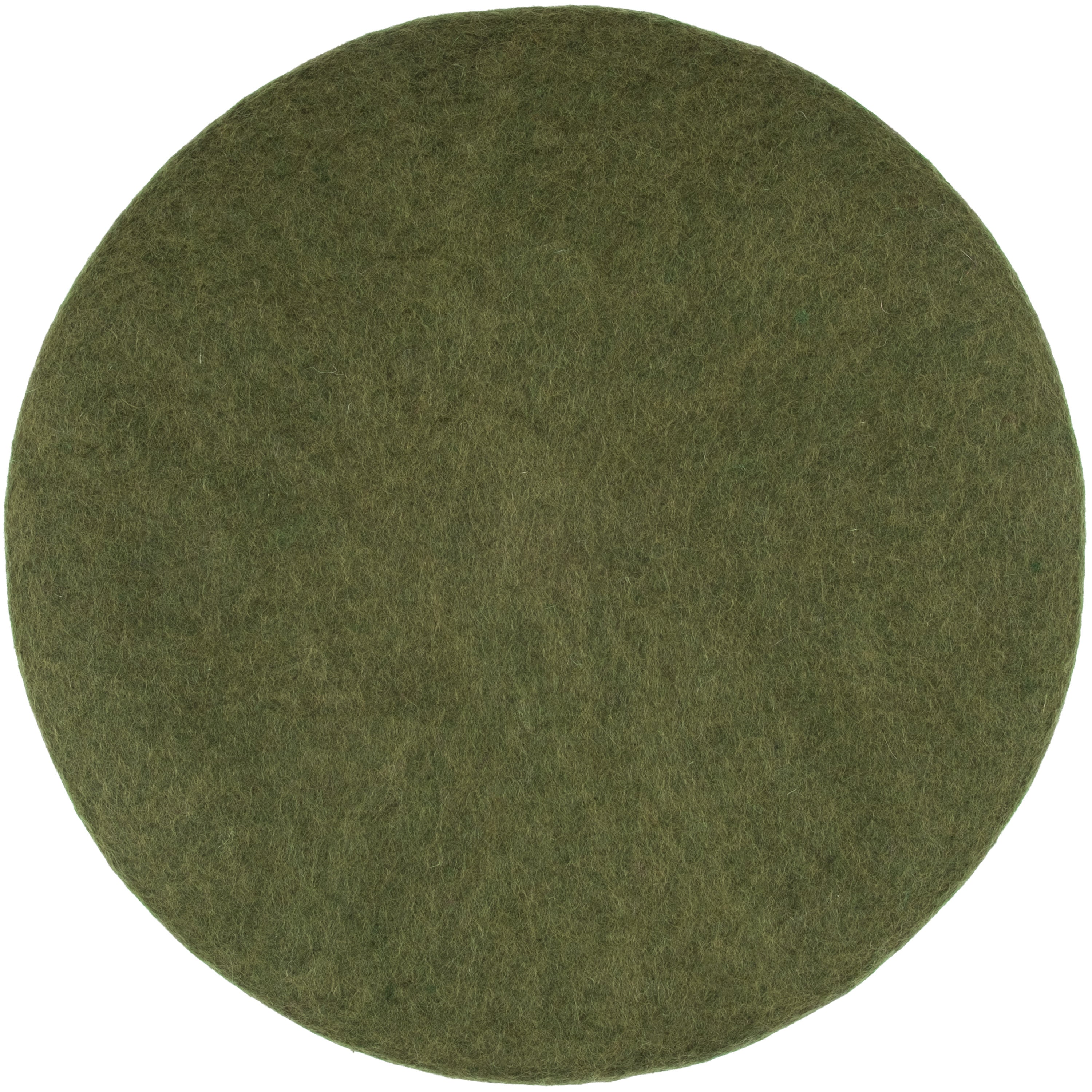 Runde, dunkelgrüne flache Sitzauflage aus reiner Schurwolle.