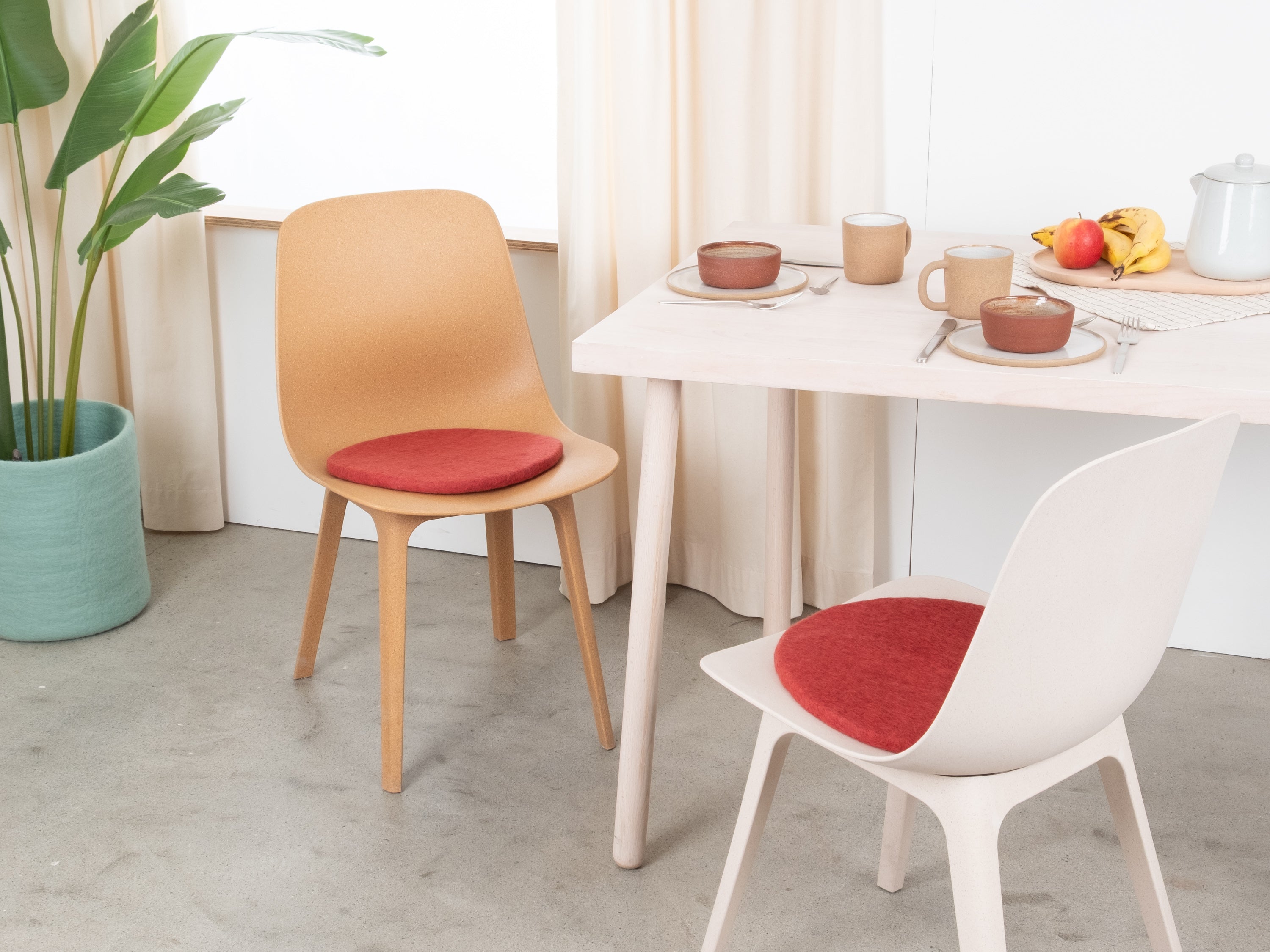 Runde, weinrote flache Sitzauflage aus reiner Schurwolle.