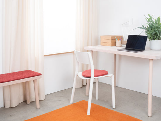 Die weinrote, flache Sitzauflage Kaja bringt Wärme und Weichheit auf deinen Lieblingsstuhl. Gefertigt aus reiner Schurwolle, von Hand in Nepal hergestellt und unter fairen Bedingungen produziert. myfelt Sitzauflagen sind wasser- und schmutzabweisend und beidseitig verwendbar.