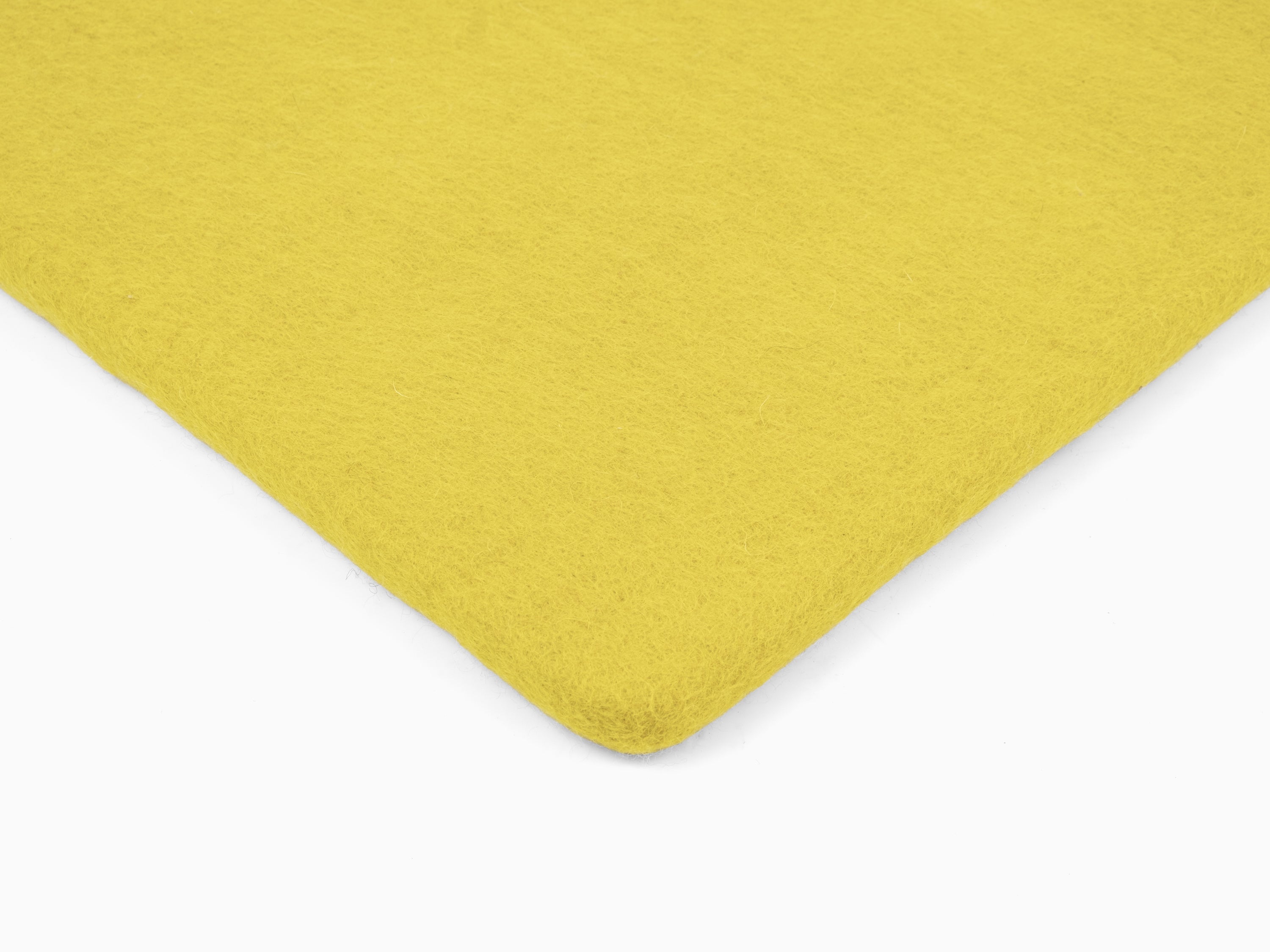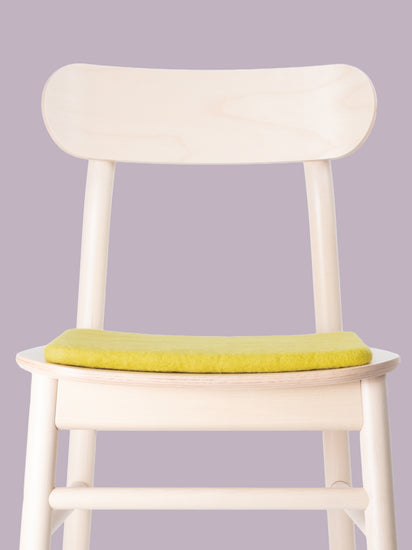 Quadratische, grüngelbe flache Sitzauflage aus reiner Schurwolle.