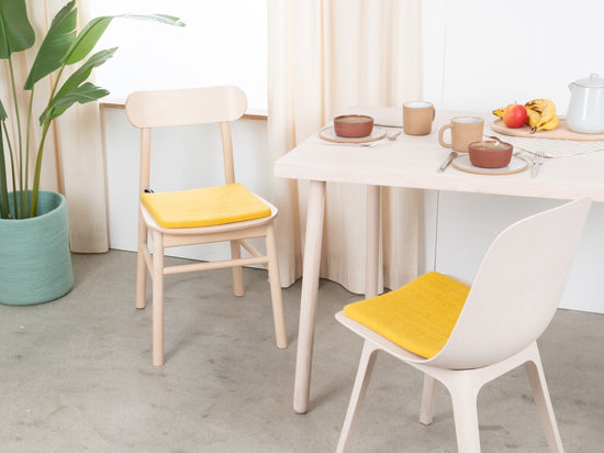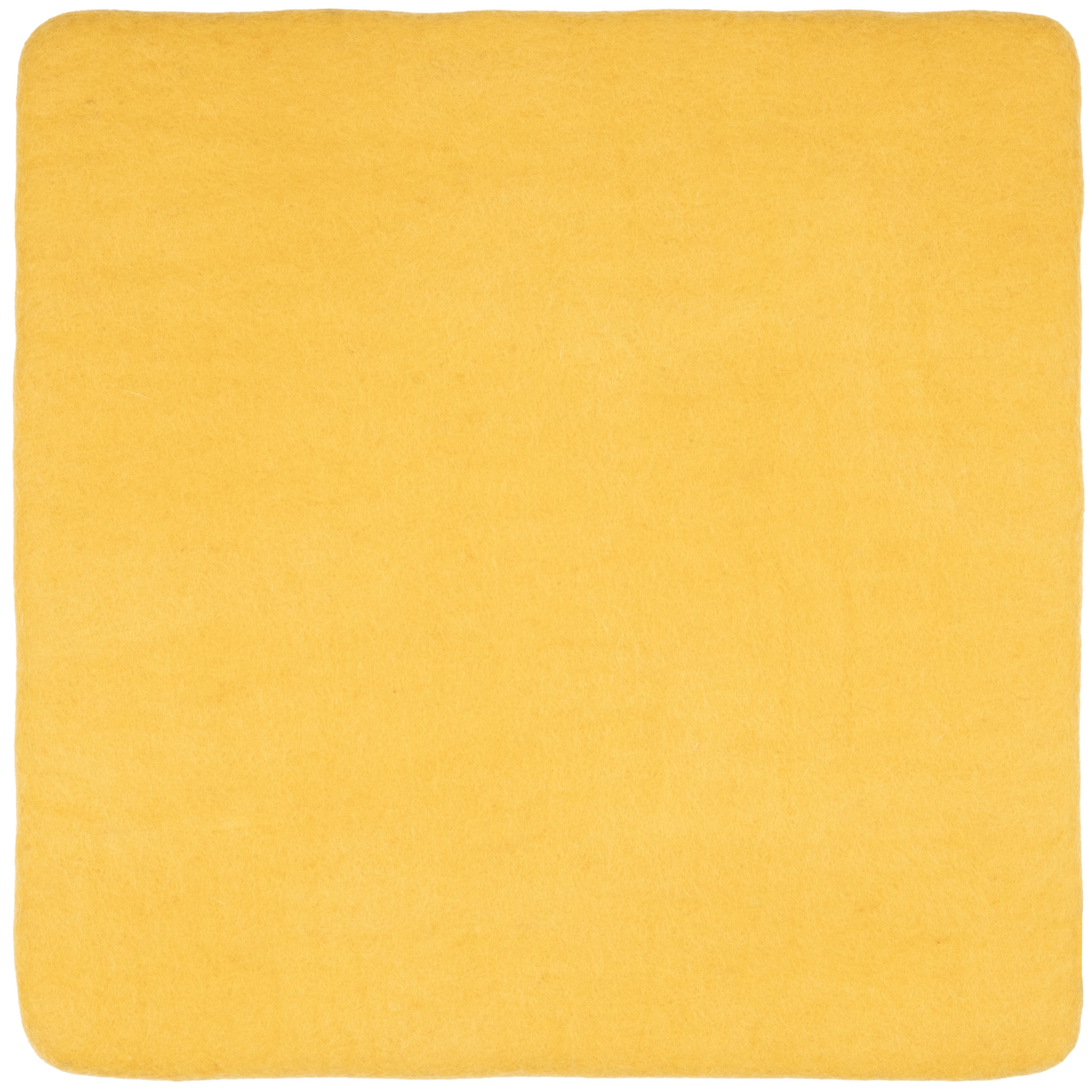 Quadratische, gelbe flache Sitzauflage aus reiner Schurwolle.
