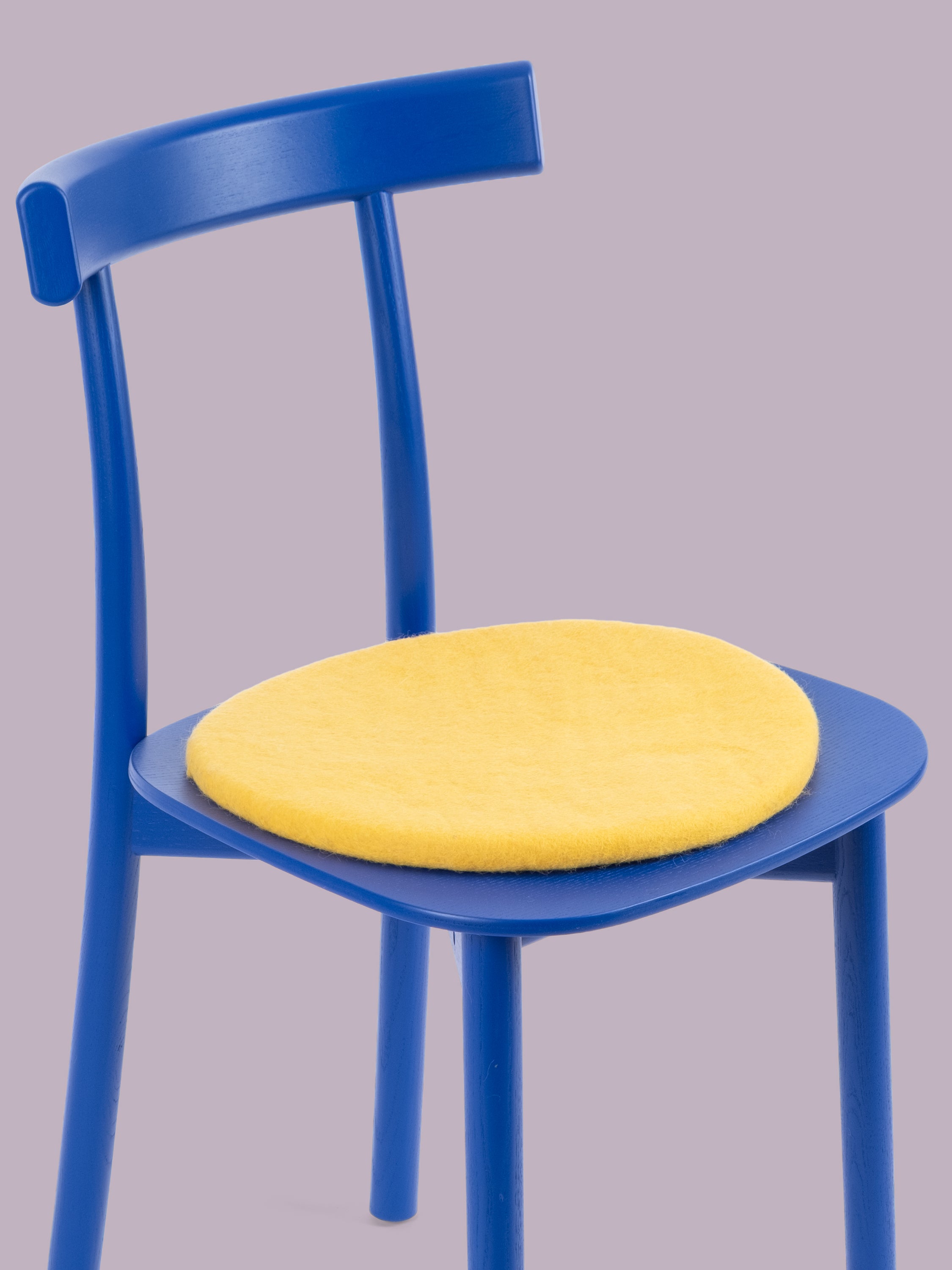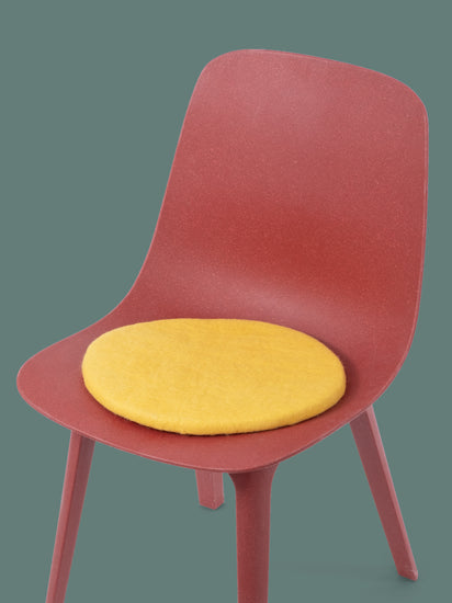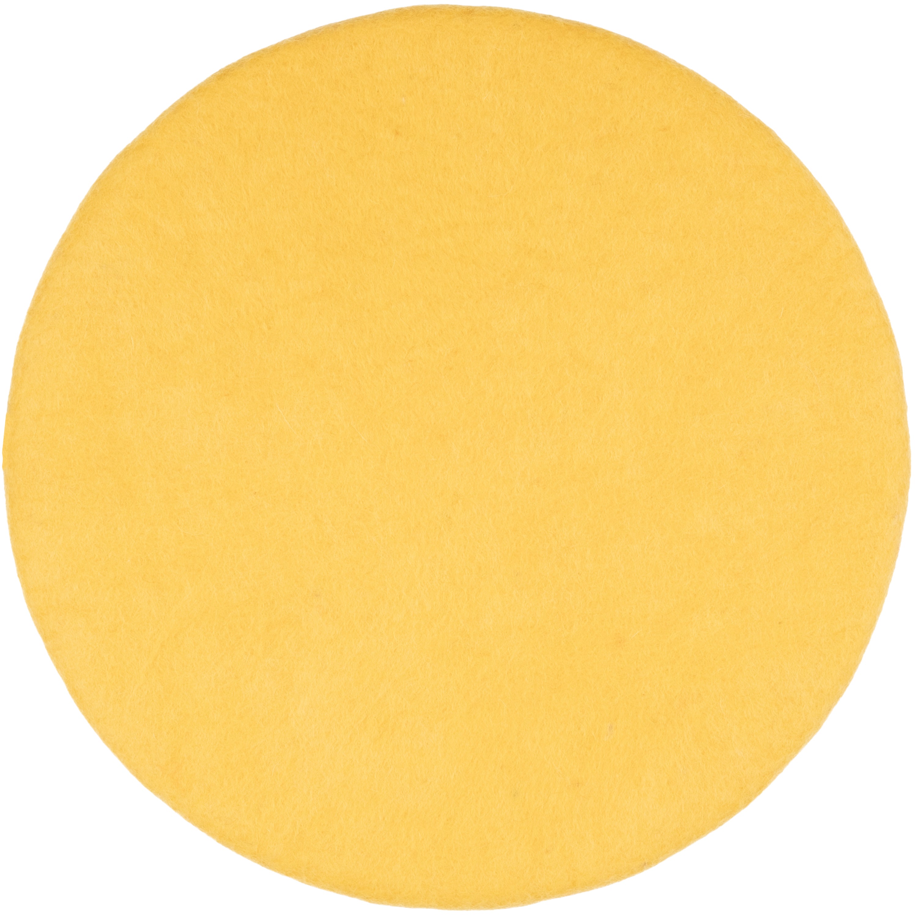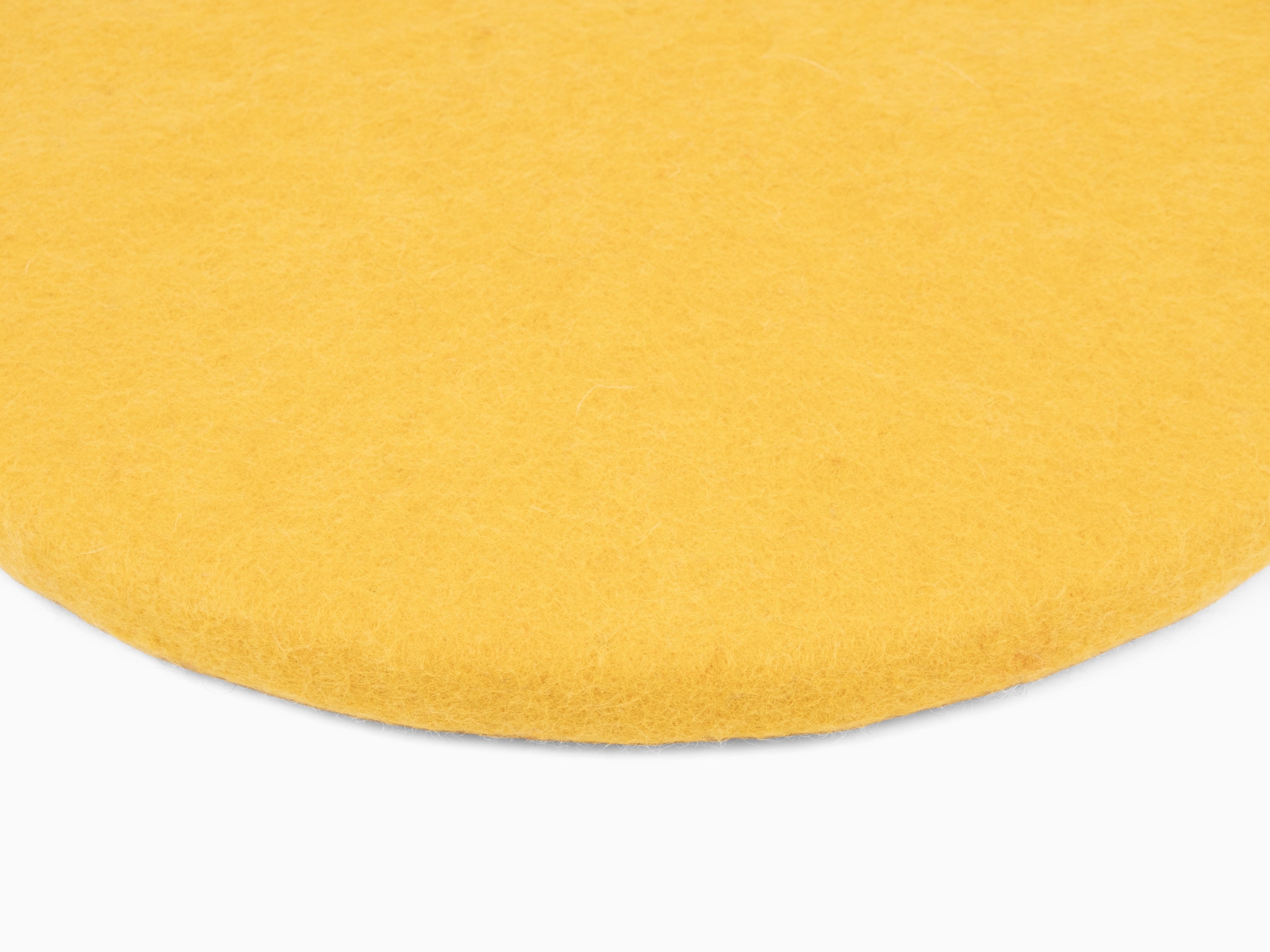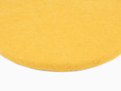 Runde, gelbe flache Sitzauflage aus reiner Schurwolle.