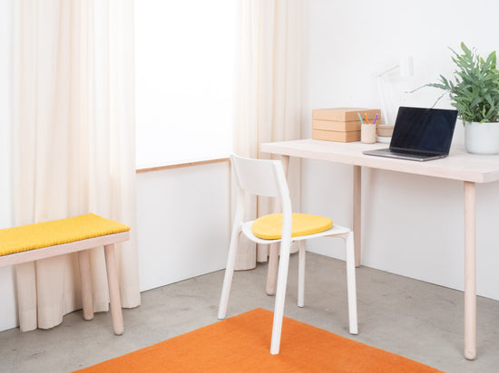 Die gelbe, flache Sitzauflage Kira bringt Wärme und Weichheit auf deinen Lieblingsstuhl. Gefertigt aus reiner Schurwolle, von Hand in Nepal hergestellt und unter fairen Bedingungen produziert. myfelt Sitzauflagen sind wasser- und schmutzabweisend und beidseitig verwendbar.