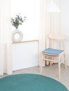 Quadratische, blaue flache Sitzauflage aus reiner Schurwolle.