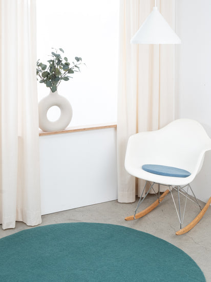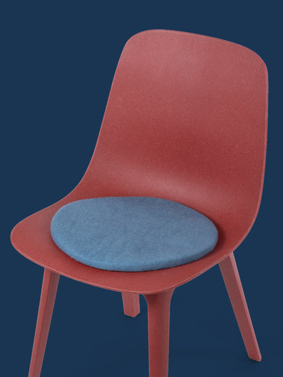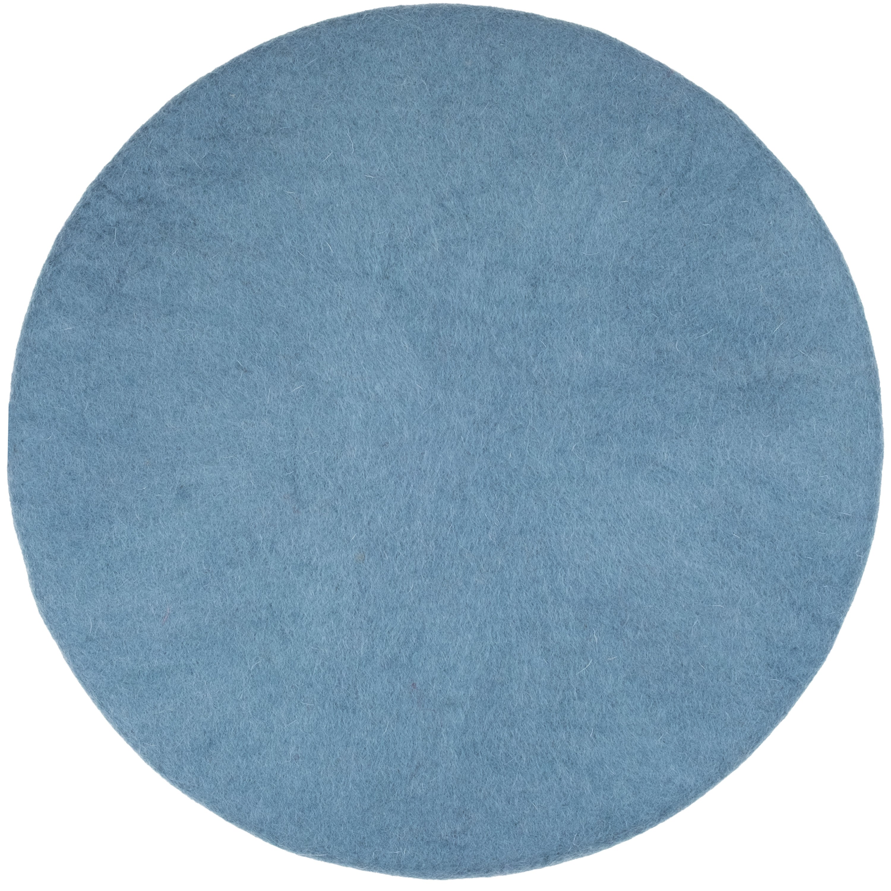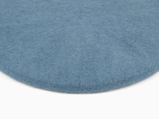 Runde, blaue flache Sitzauflage aus reiner Schurwolle.
