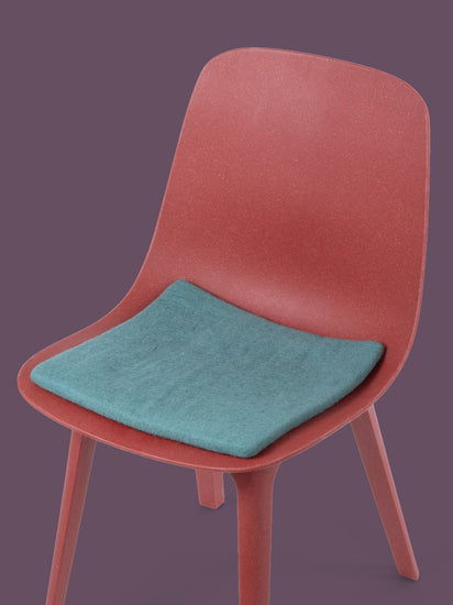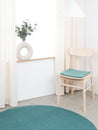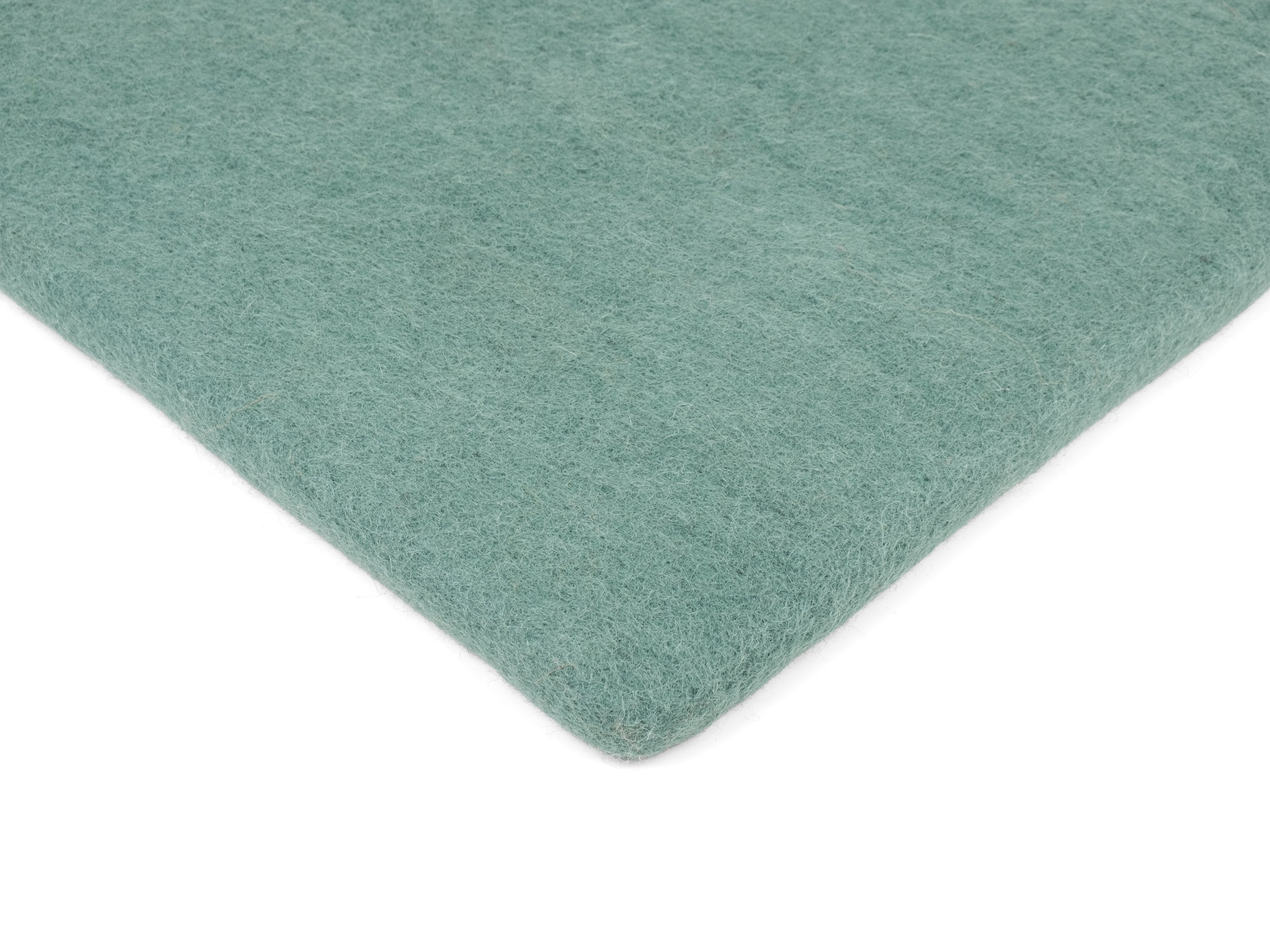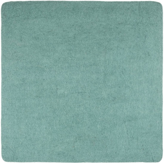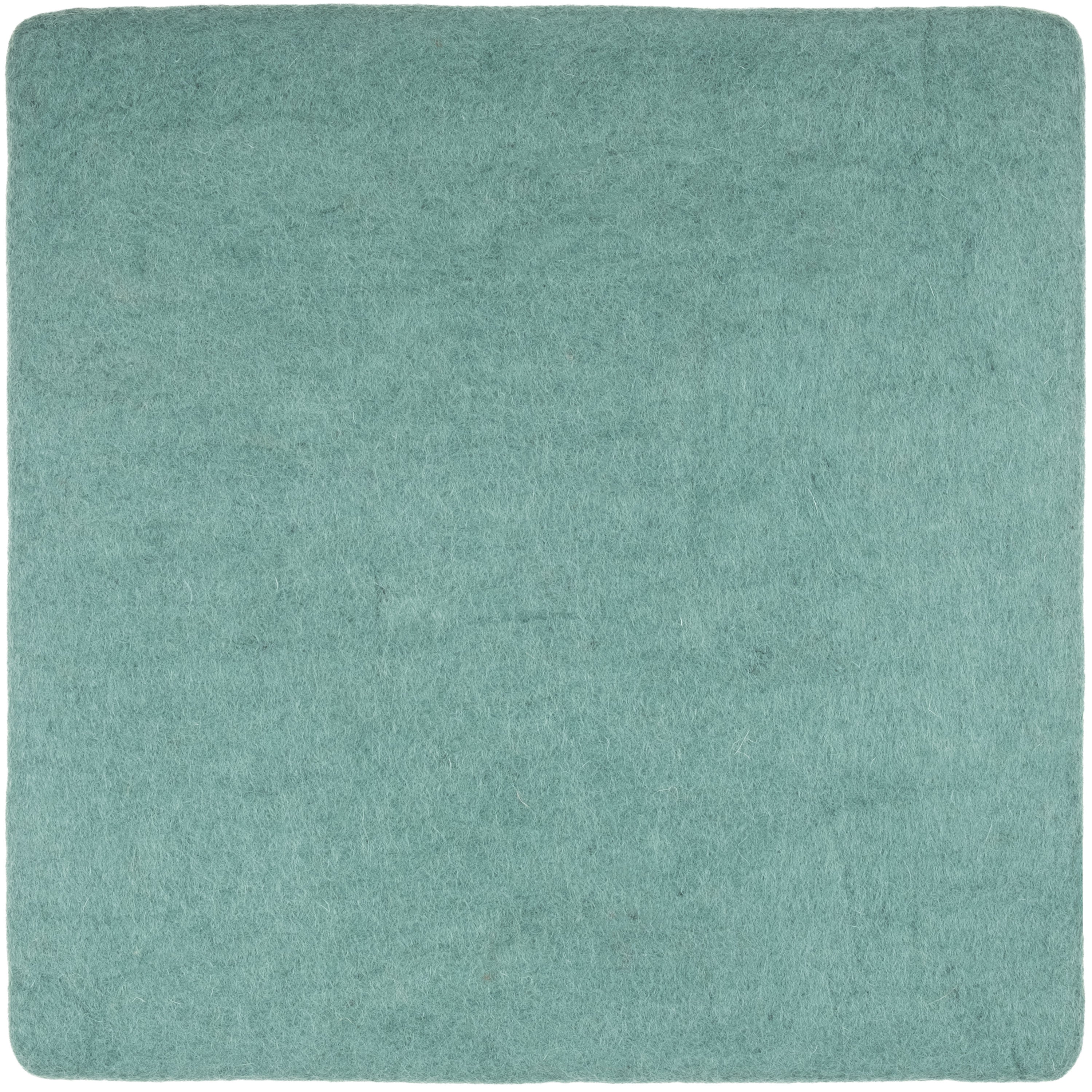 Quadratische, aquafarbene flache Sitzauflage aus reiner Schurwolle.