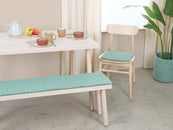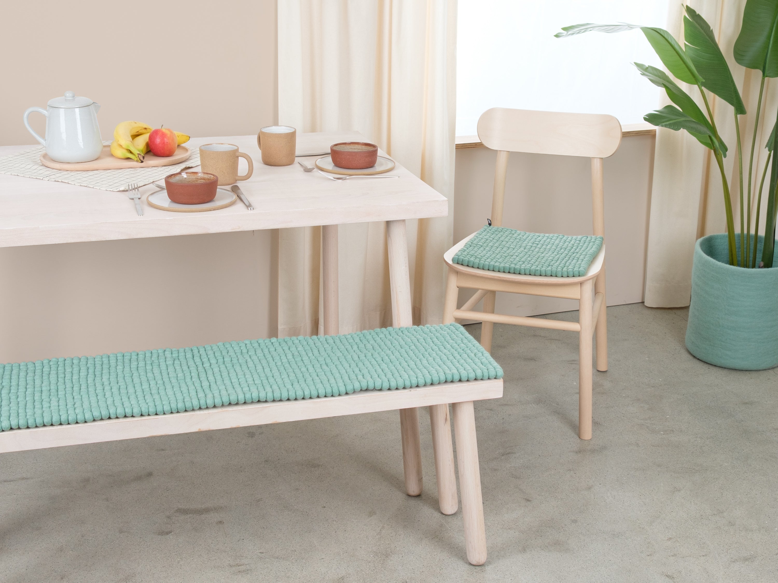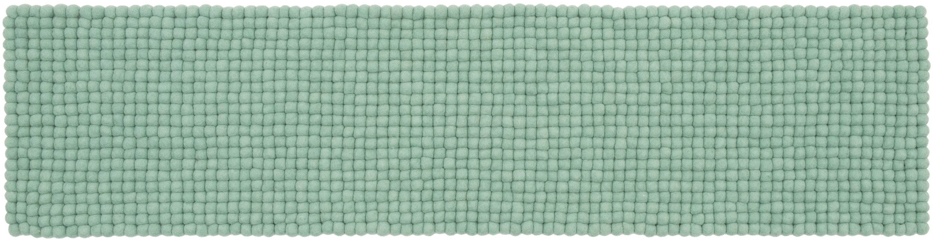 Türkise Filzkugel-Bankauflage aus Schurwolle in Ihrem Wunschmaß.