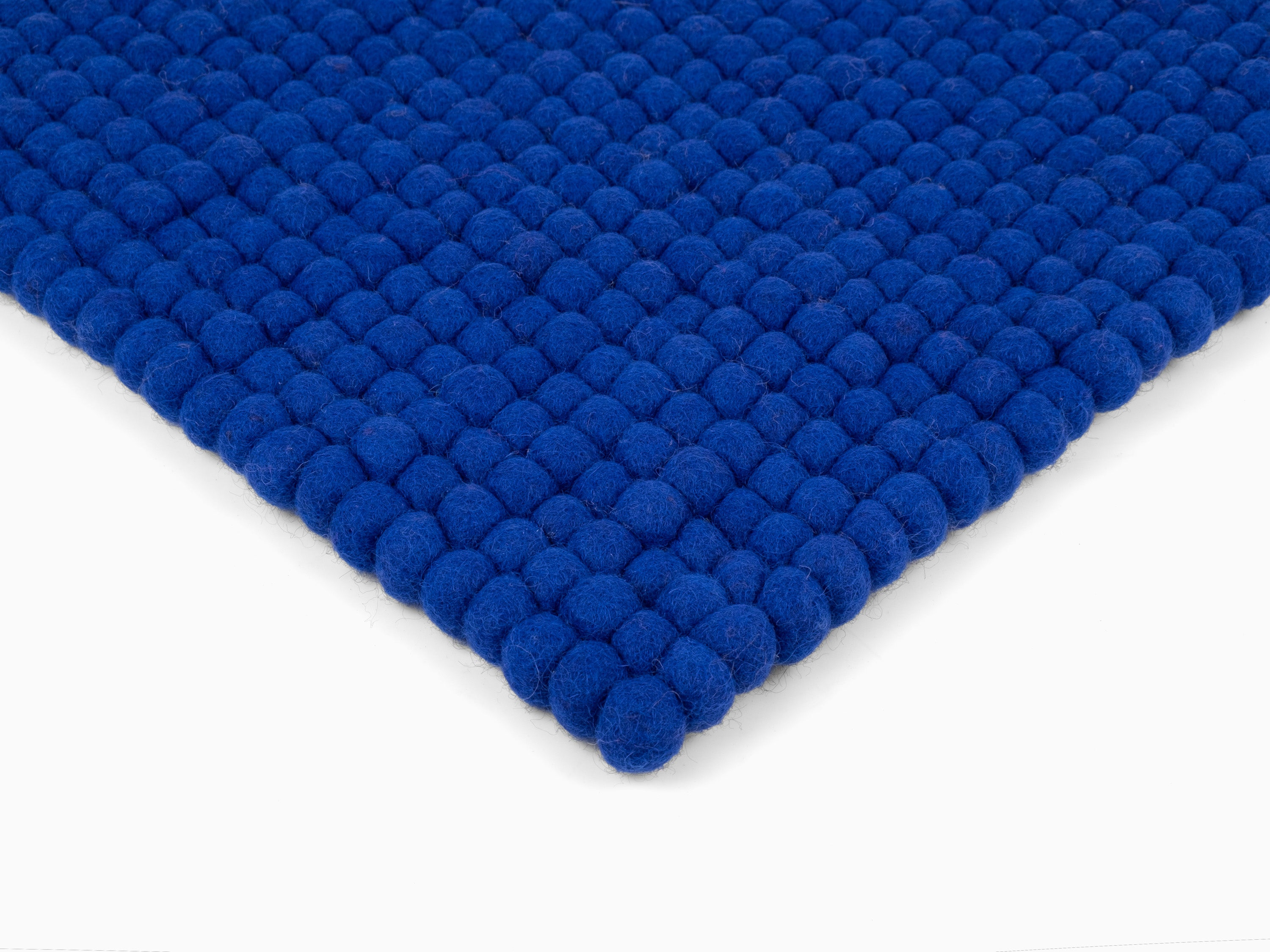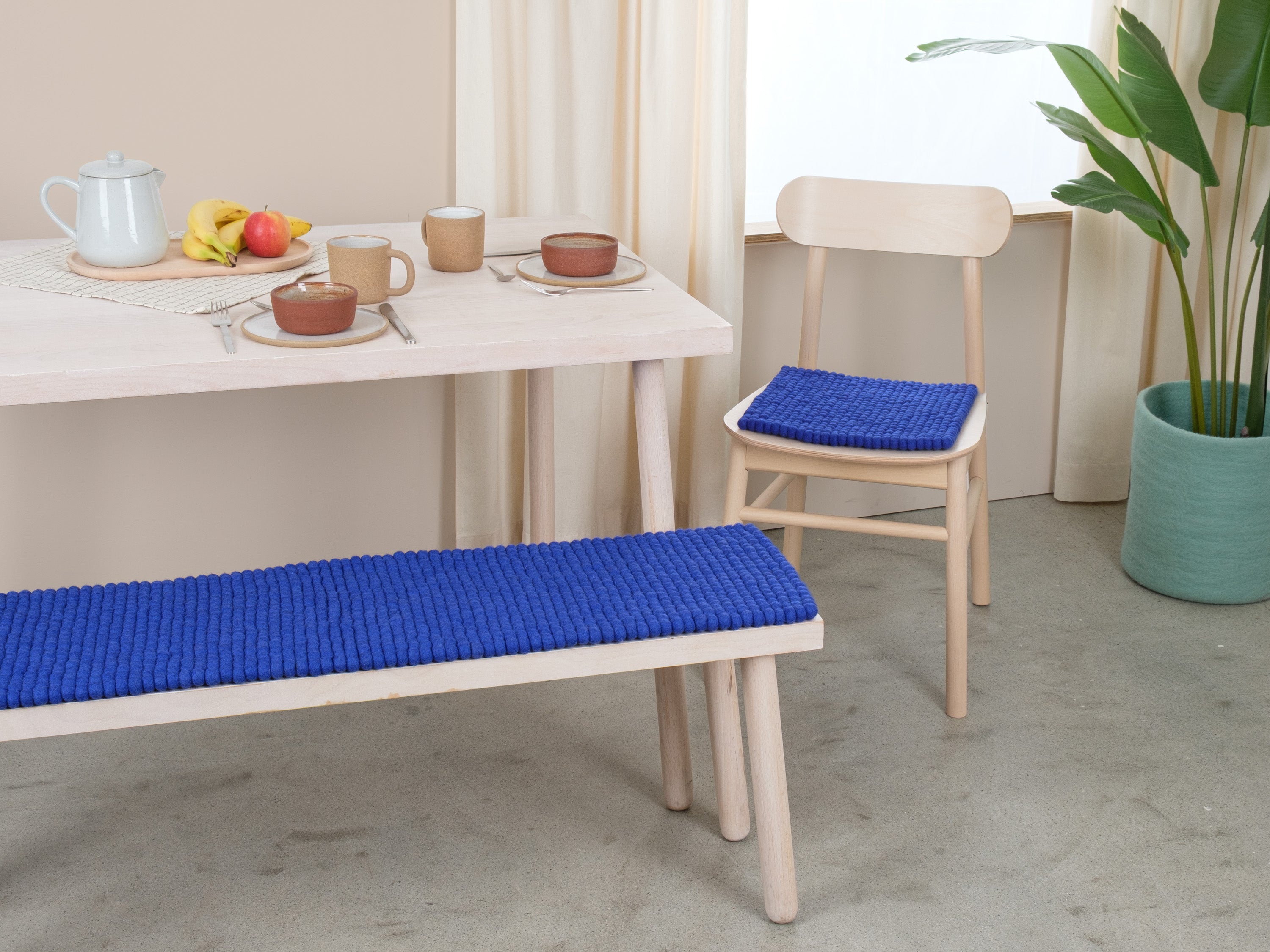 Royalblaue Filzkugel-Bankauflage aus Schurwolle in Ihrem Wunschmaß.