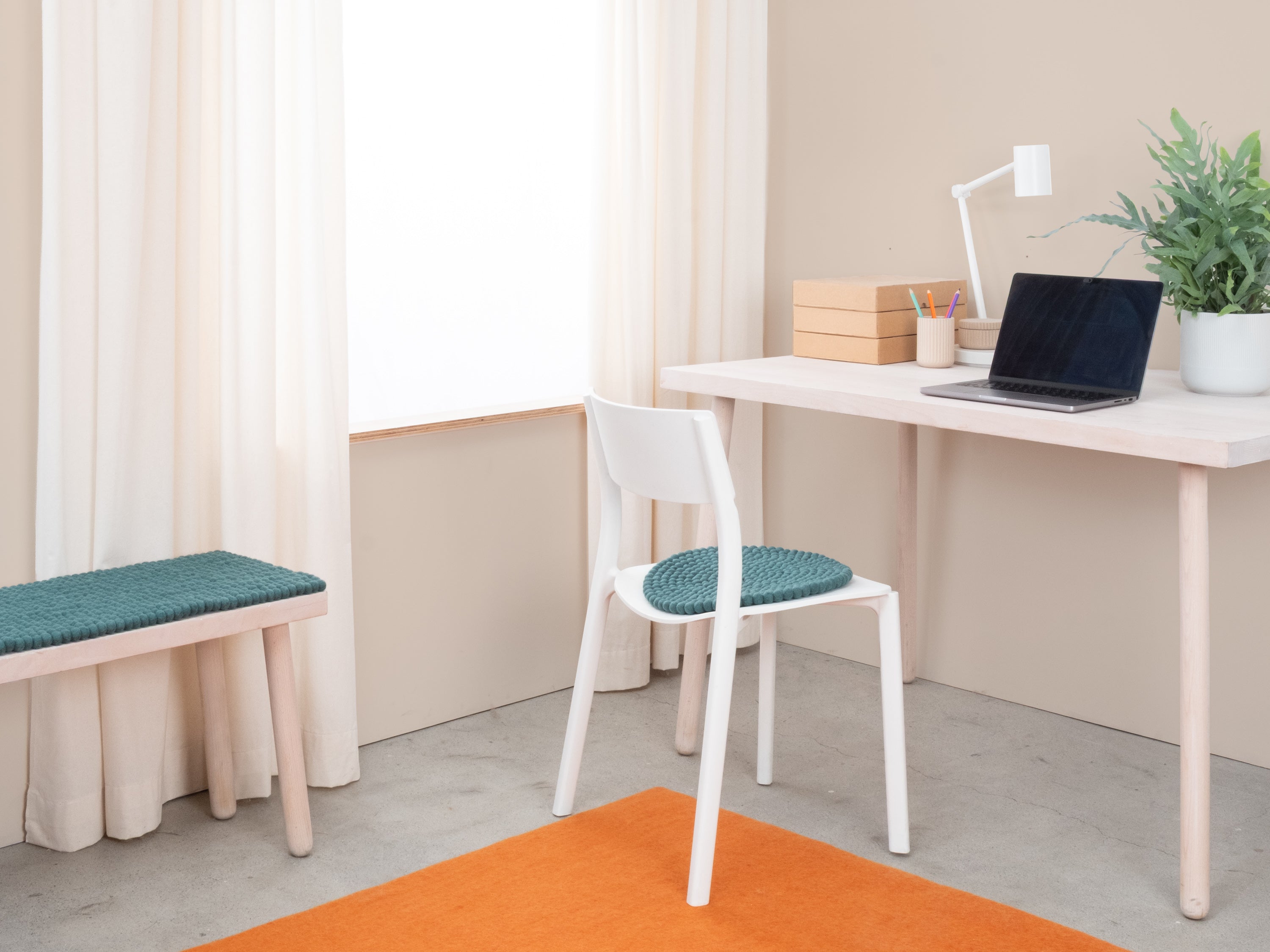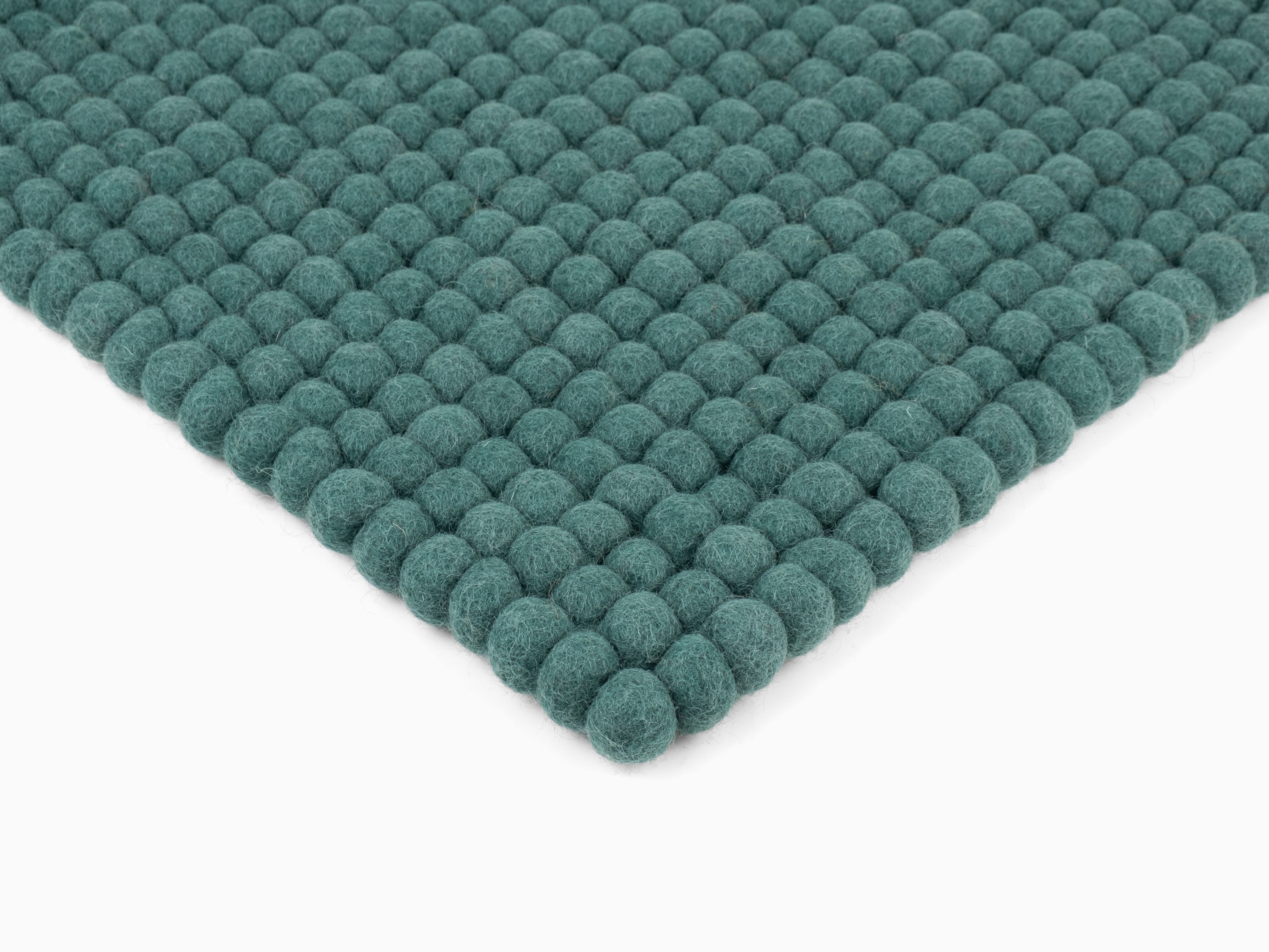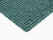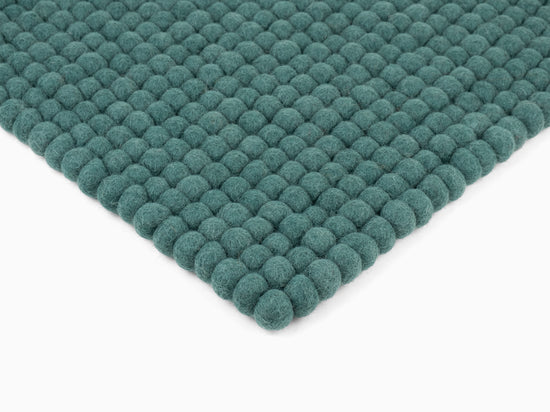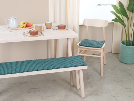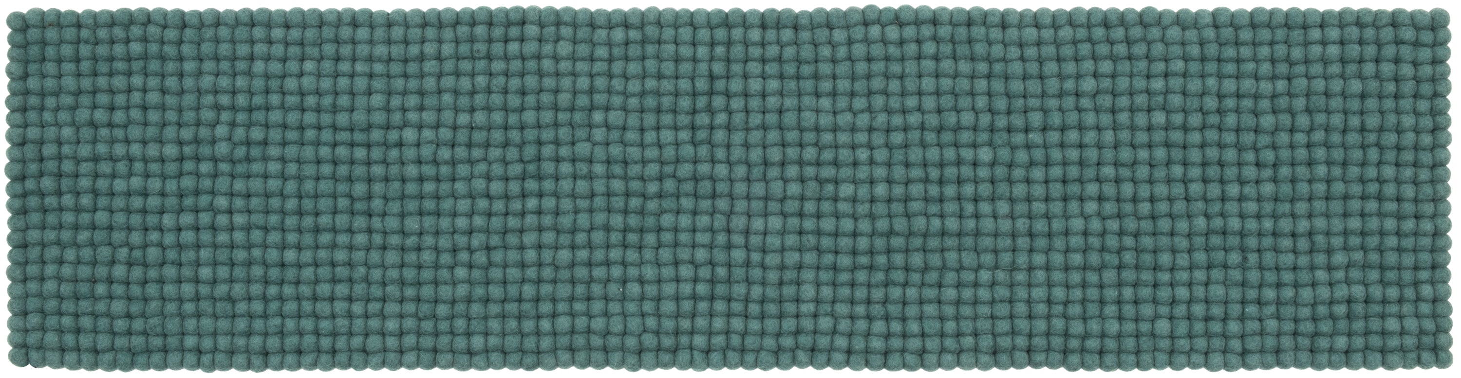 Petrolfarbene Filzkugel-Bankauflage aus Schurwolle in Ihrem Wunschmaß.
