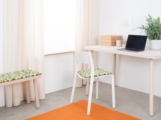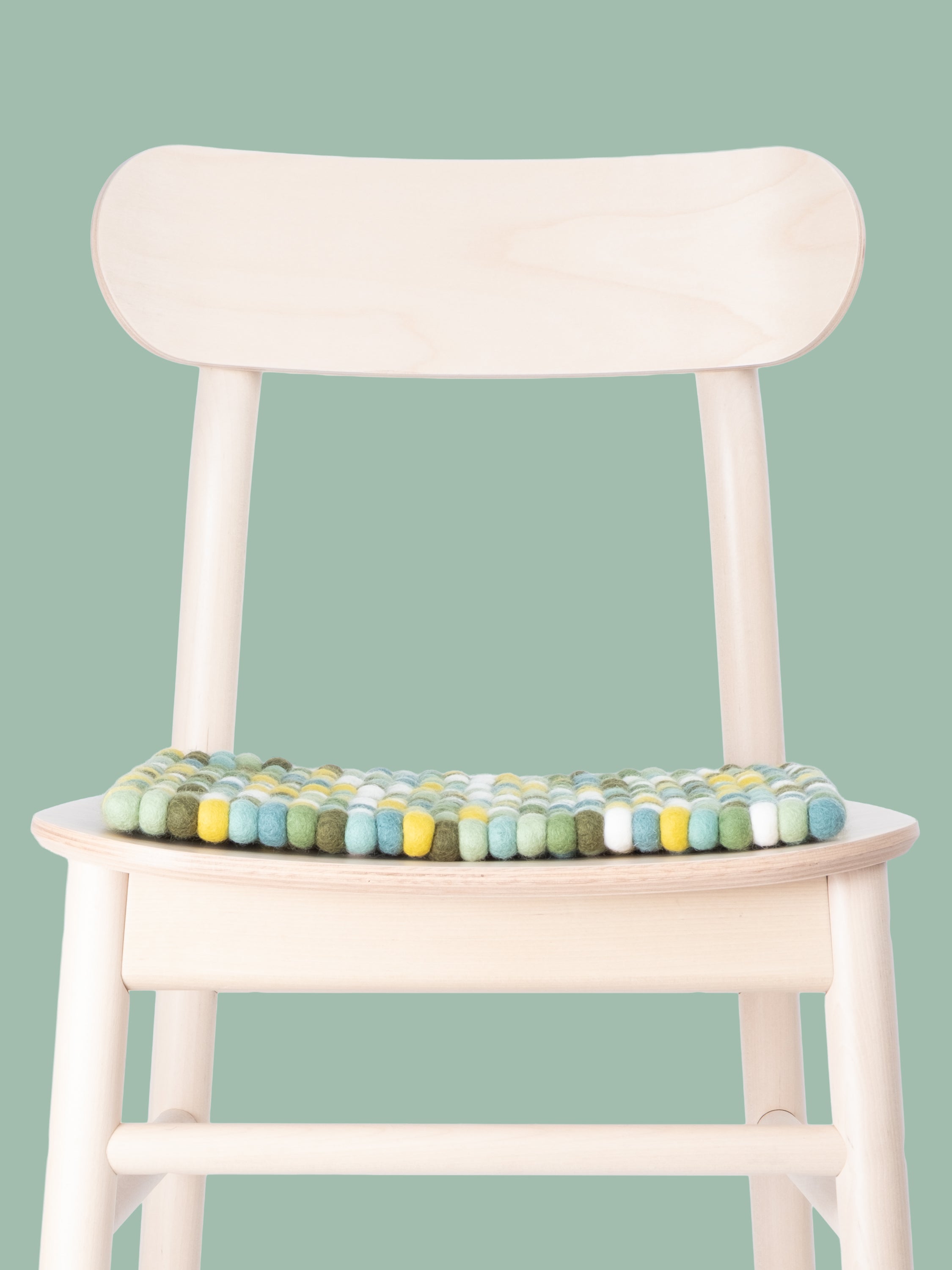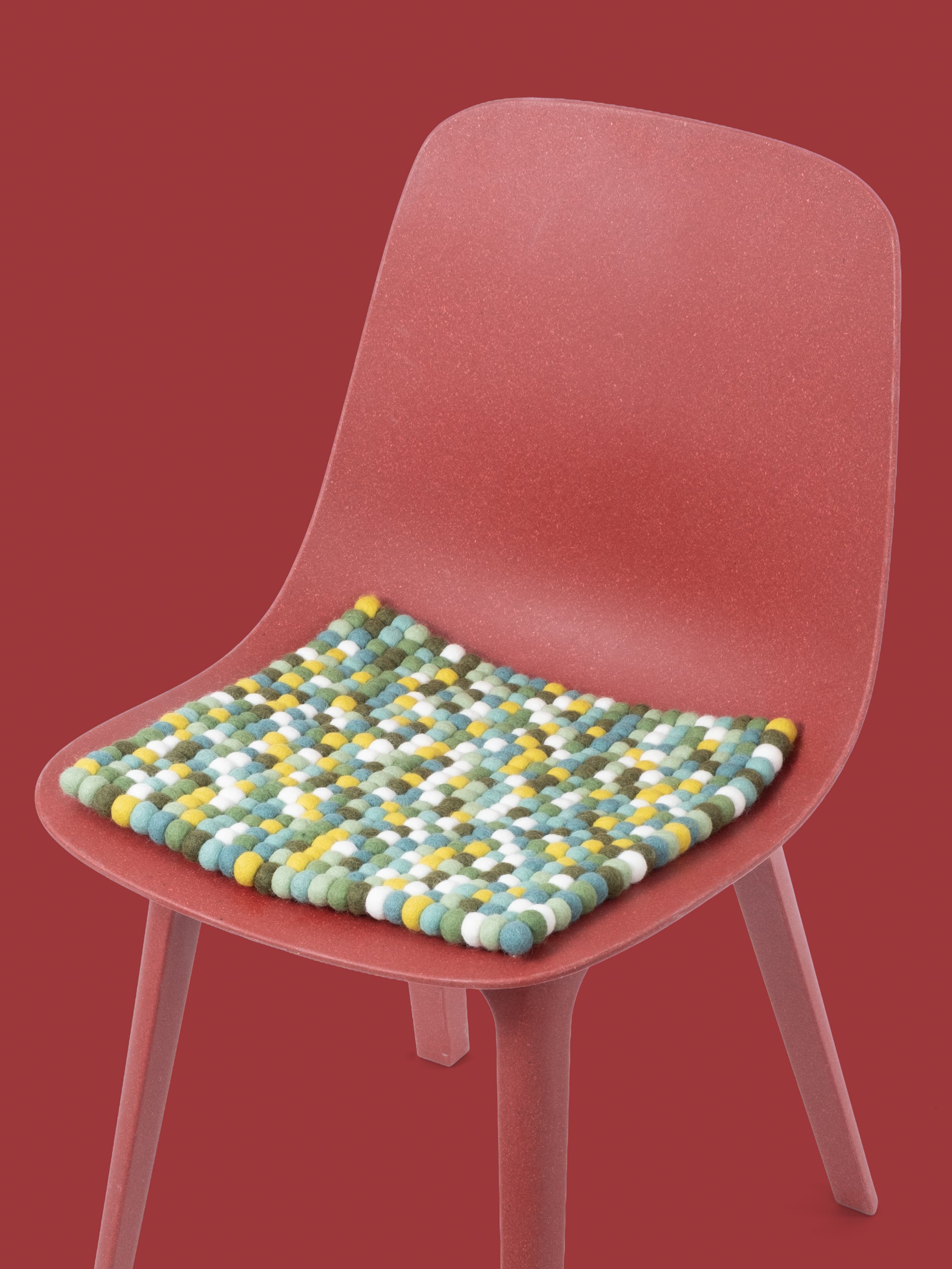 Die multifarbene Sitzauflage Finn bringt Wärme und Weichheit auf deinen Lieblingsstuhl. Gefertigt aus reiner Schurwolle, von Hand in Nepal hergestellt und unter fairen Bedingungen produziert. myfelt Sitzauflagen sind wasser- und schmutzabweisend und beidseitig verwendbar.