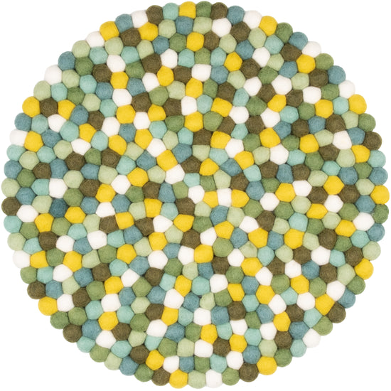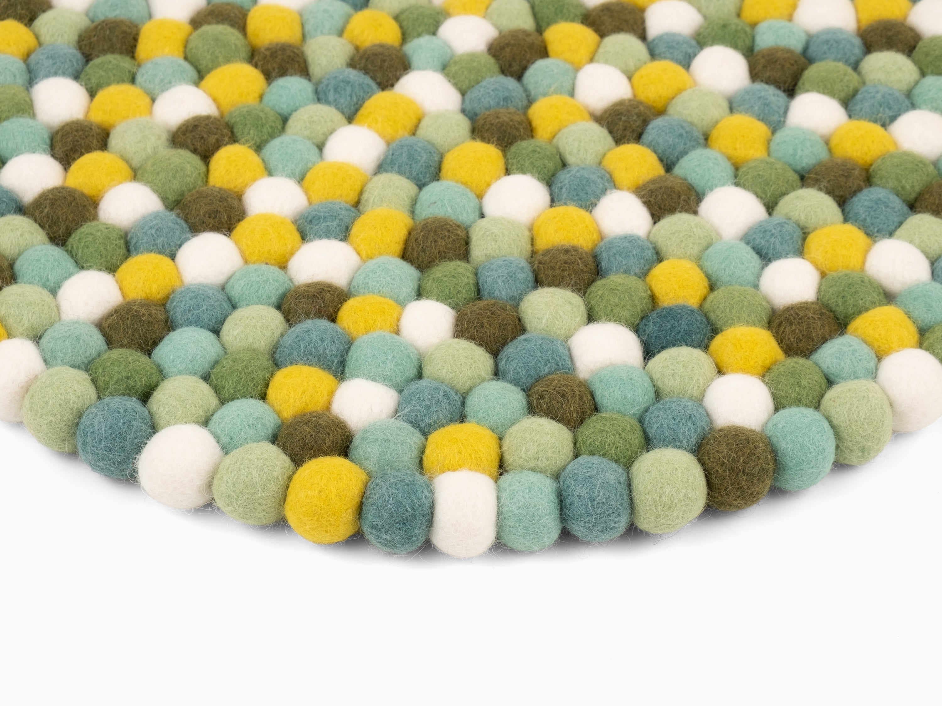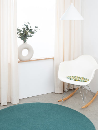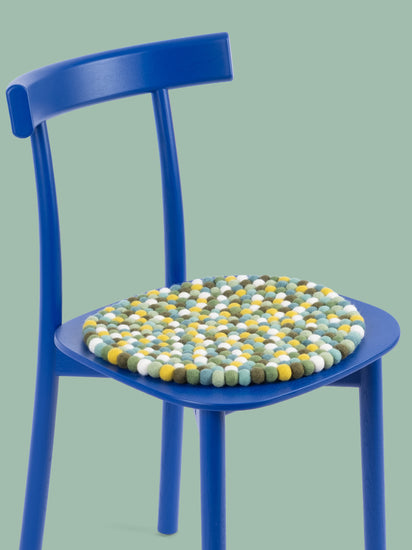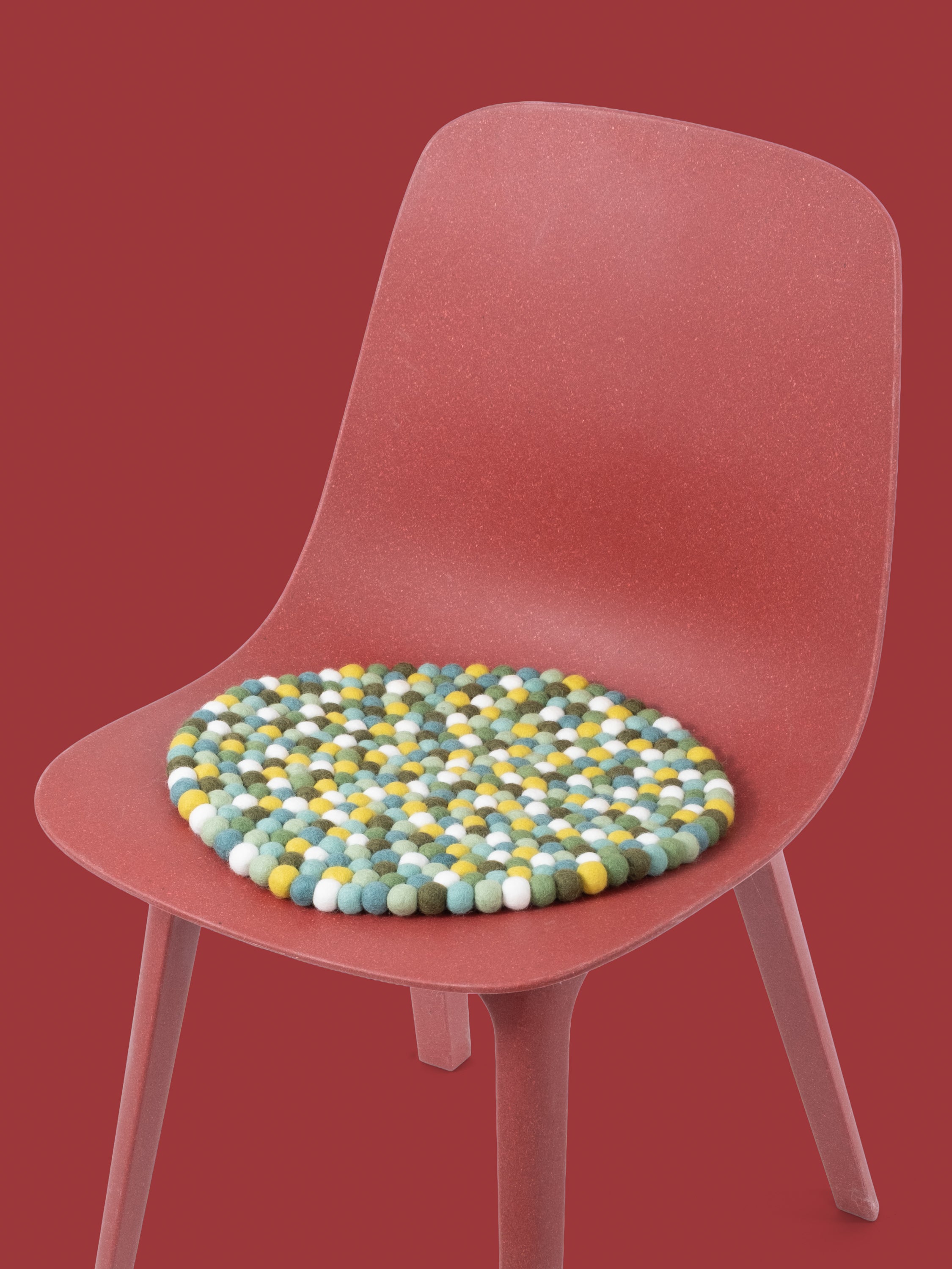 Die multifarbene Sitzauflage Finn bringt Wärme und Weichheit auf deinen Lieblingsstuhl. Gefertigt aus reiner Schurwolle, von Hand in Nepal hergestellt und unter fairen Bedingungen produziert. myfelt Sitzauflagen sind wasser- und schmutzabweisend und beidseitig verwendbar.