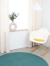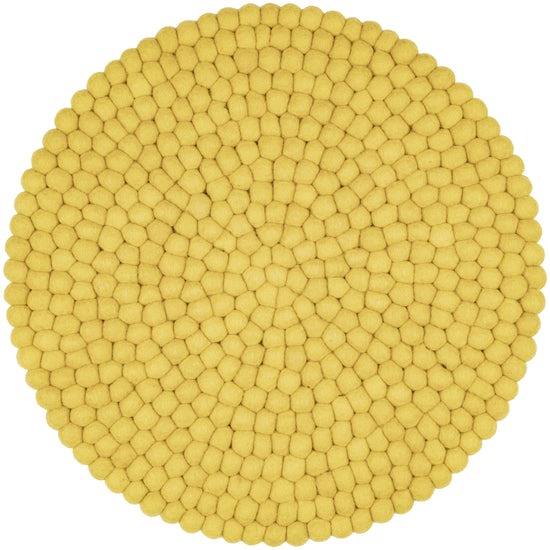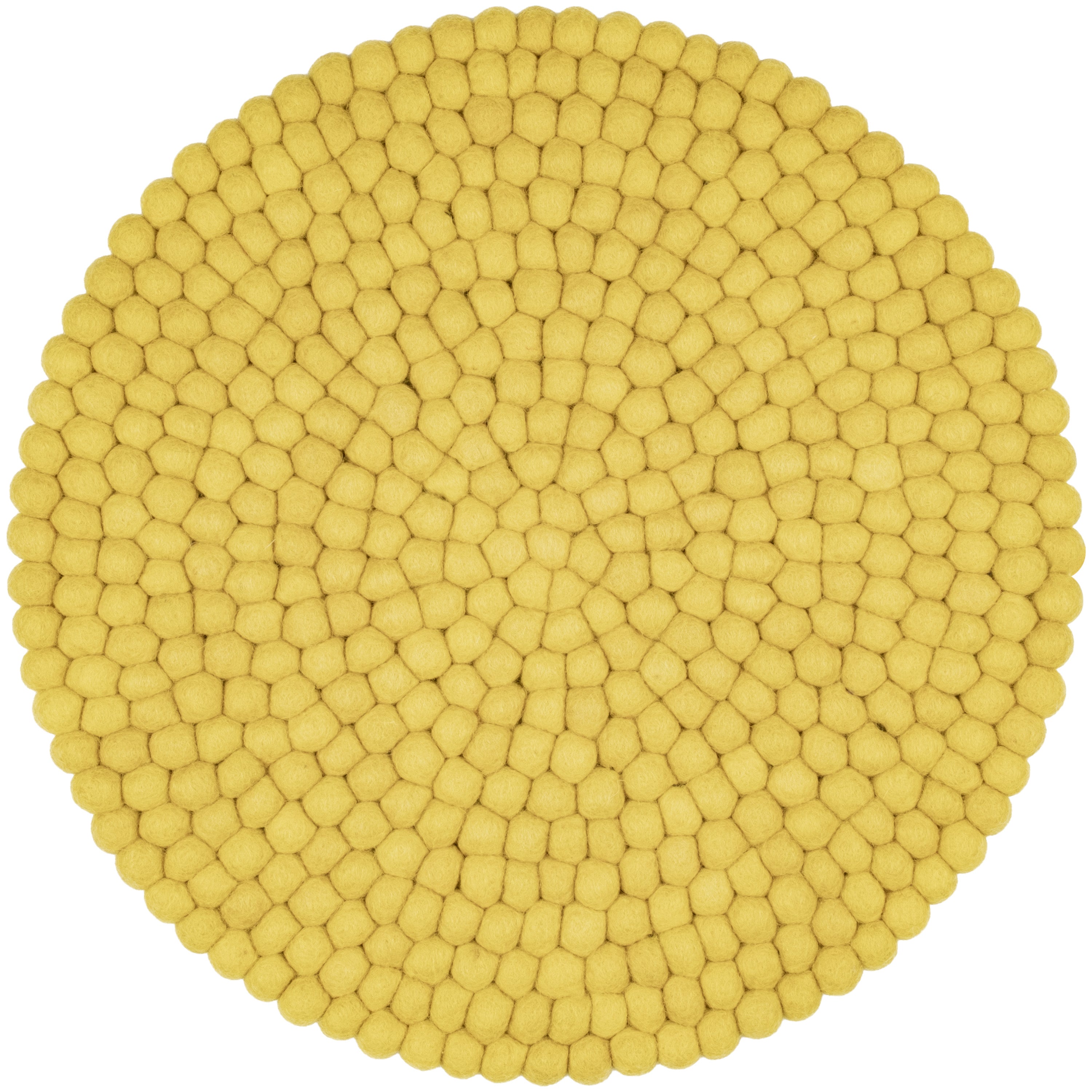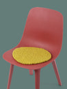Runde, grüngelbe Sitzauflage aus reiner Schurwolle.