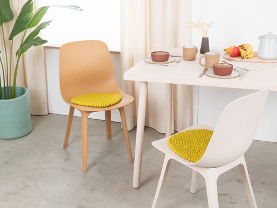 Die grüngelbe Sitzauflage Kata bringt Wärme und Weichheit auf deinen Lieblingsstuhl. Gefertigt aus reiner Schurwolle, von Hand in Nepal hergestellt und unter fairen Bedingungen produziert. myfelt Sitzauflagen sind wasser- und schmutzabweisend und beidseitig verwendbar.