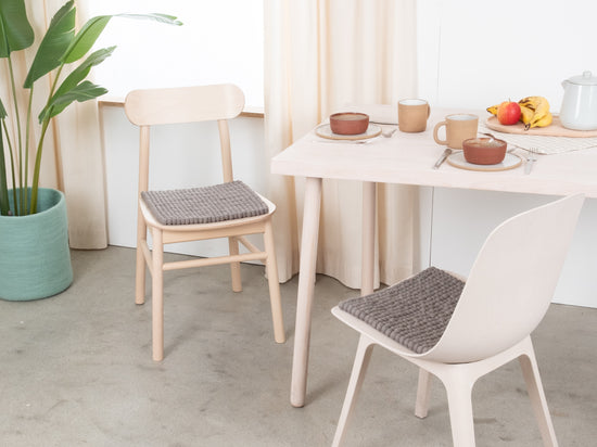 Quadratische, graue Sitzauflage aus reiner Schurwolle.