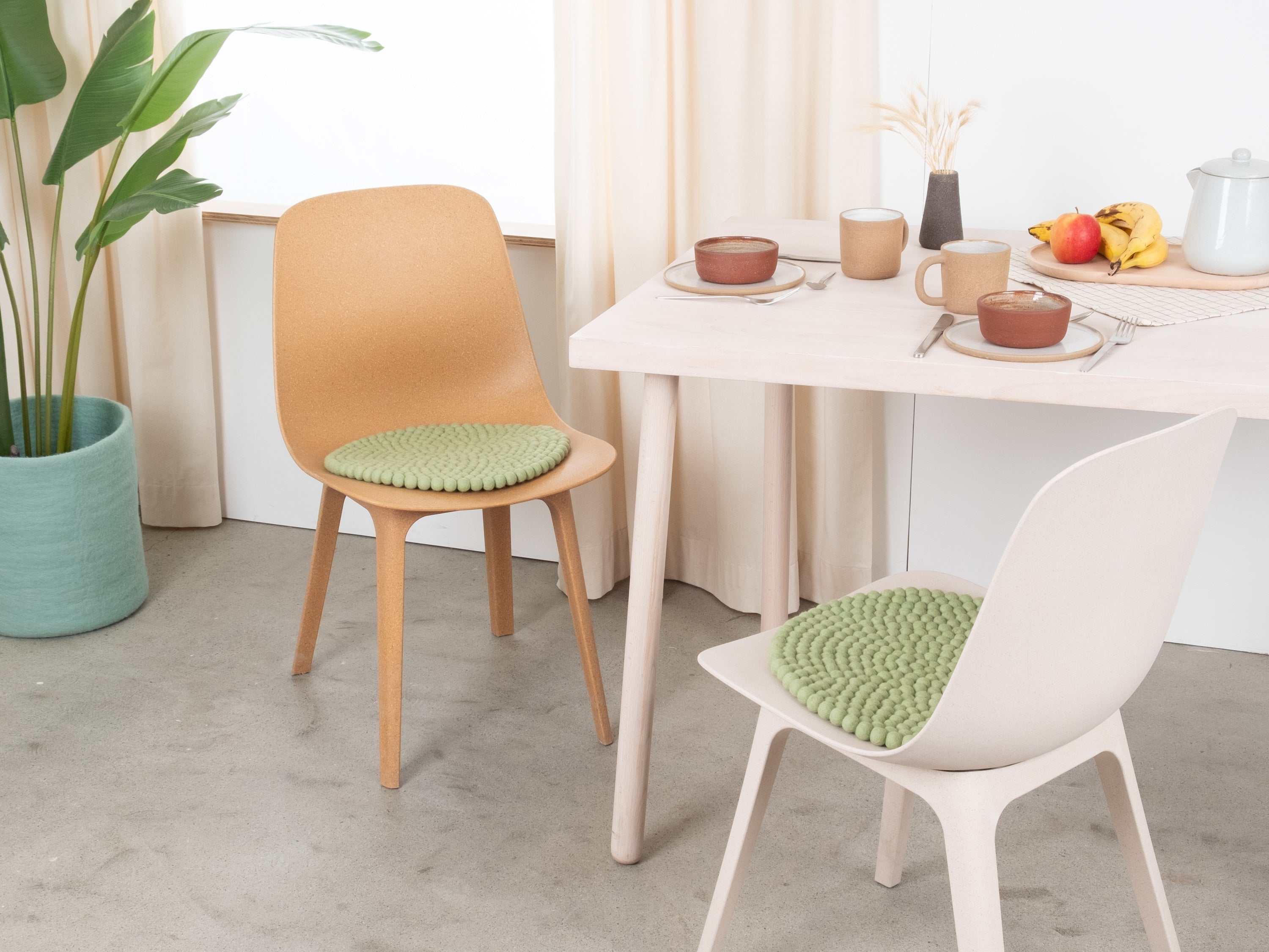 Runde, hellgrüne Sitzauflage aus reiner Schurwolle.