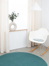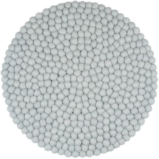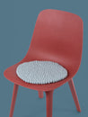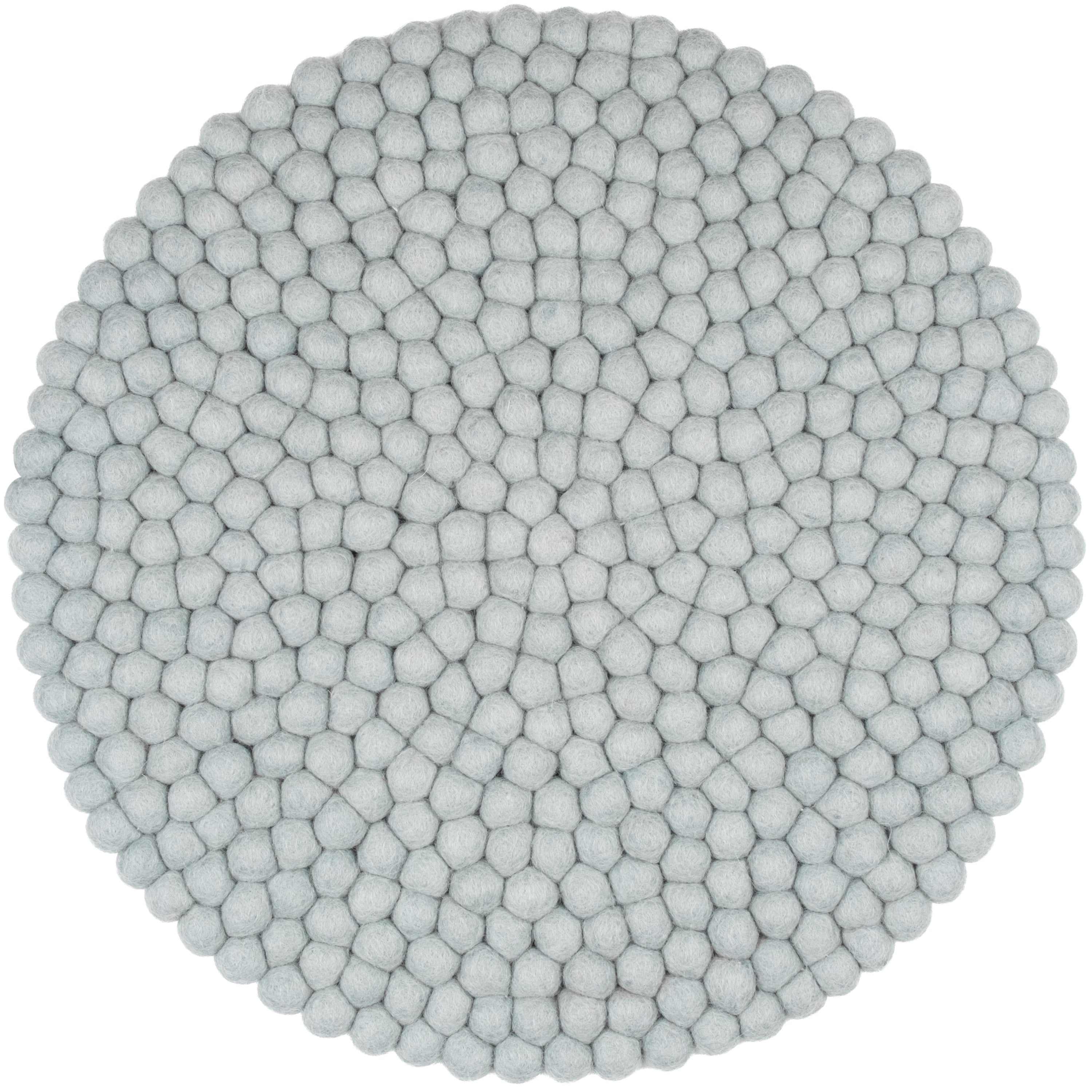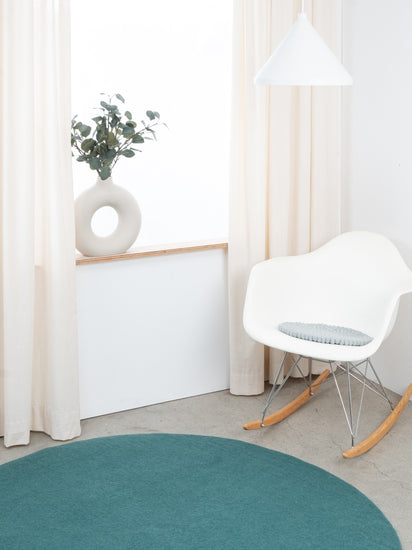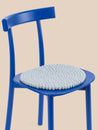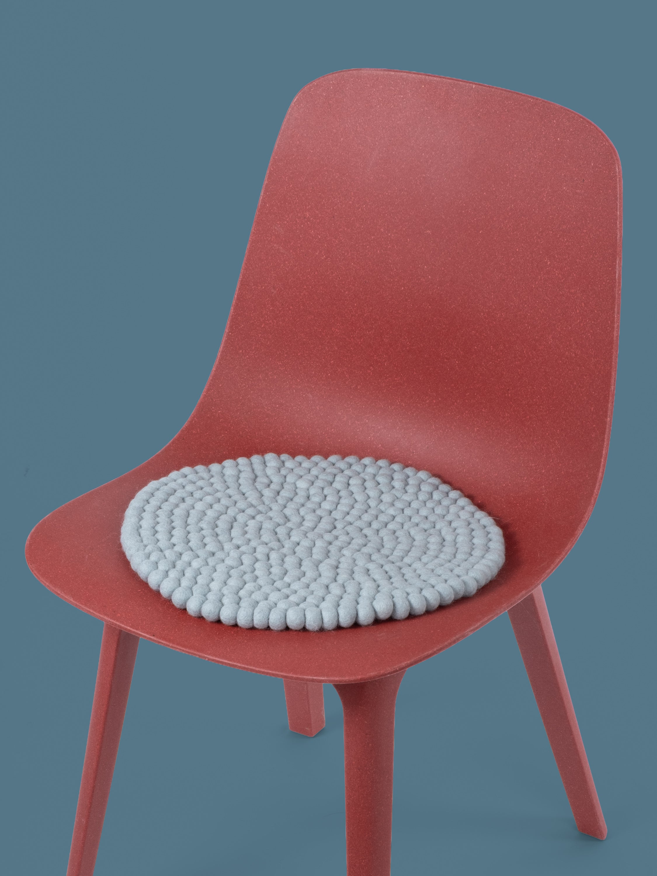 Runde, hellblaue Sitzauflage aus reiner Schurwolle.