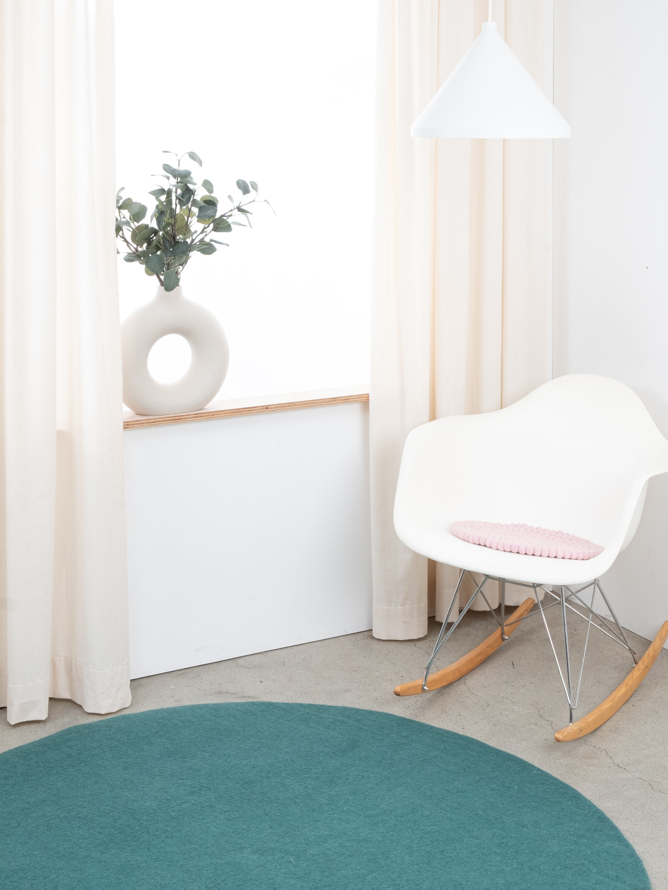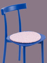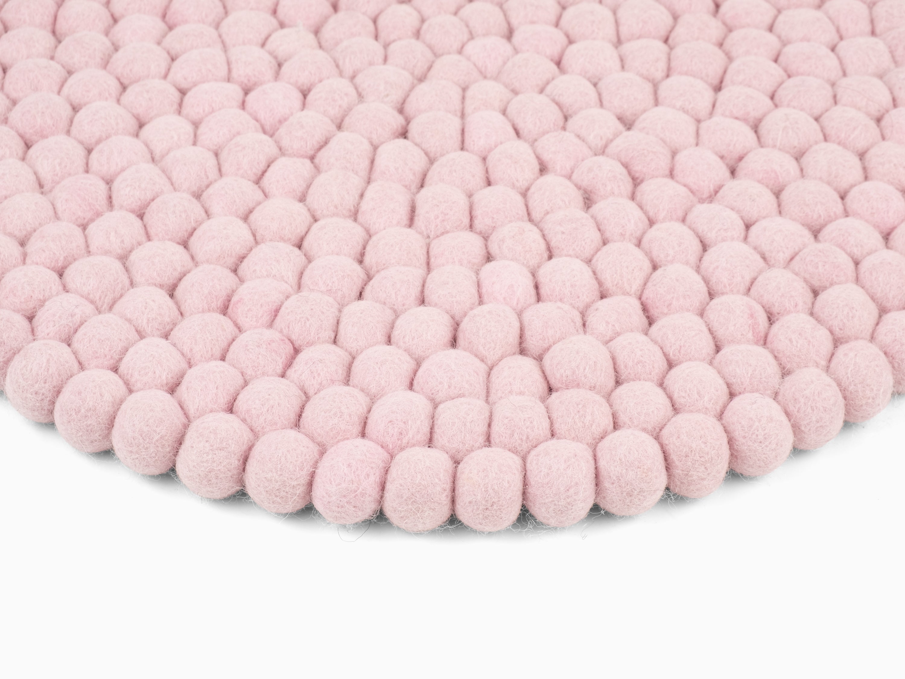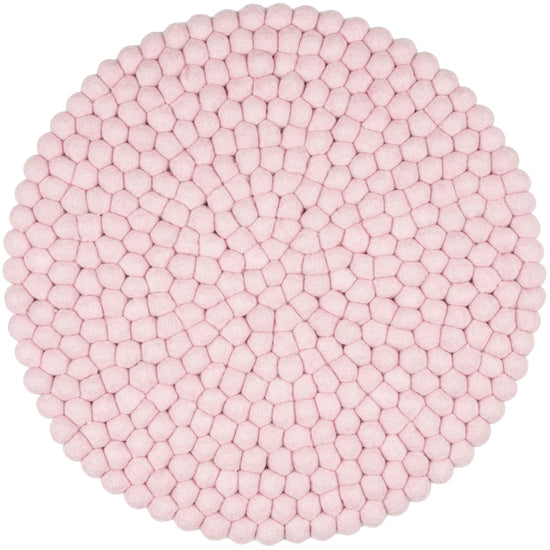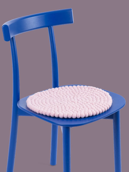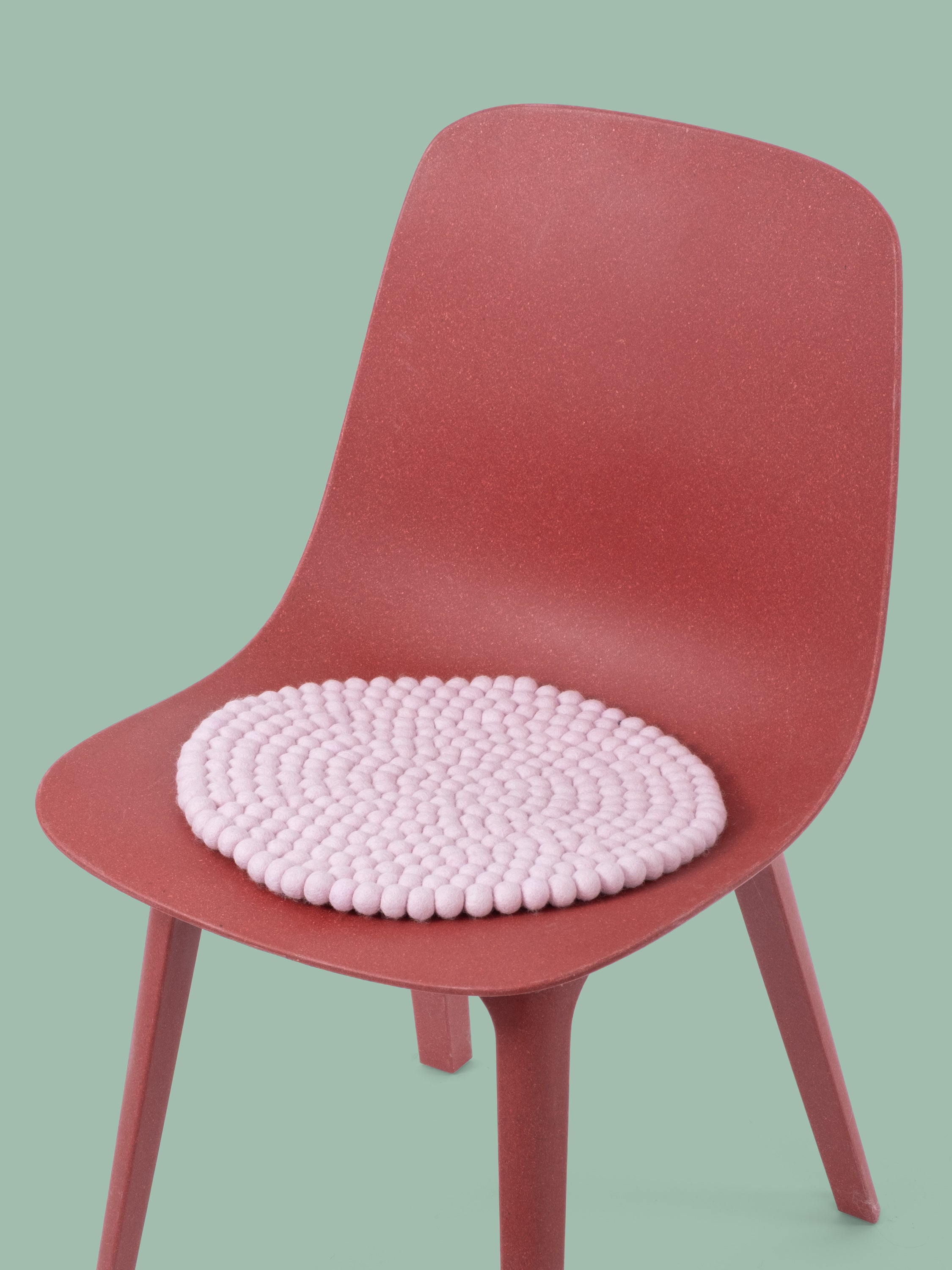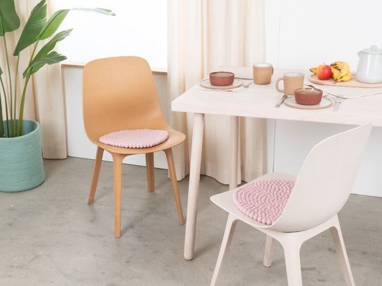 Runde, zartrosa Sitzauflage aus reiner Schurwolle.