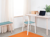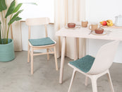 Quadratische, aquafarbene Sitzauflage aus reiner Schurwolle.