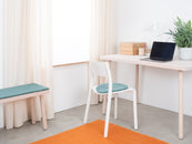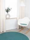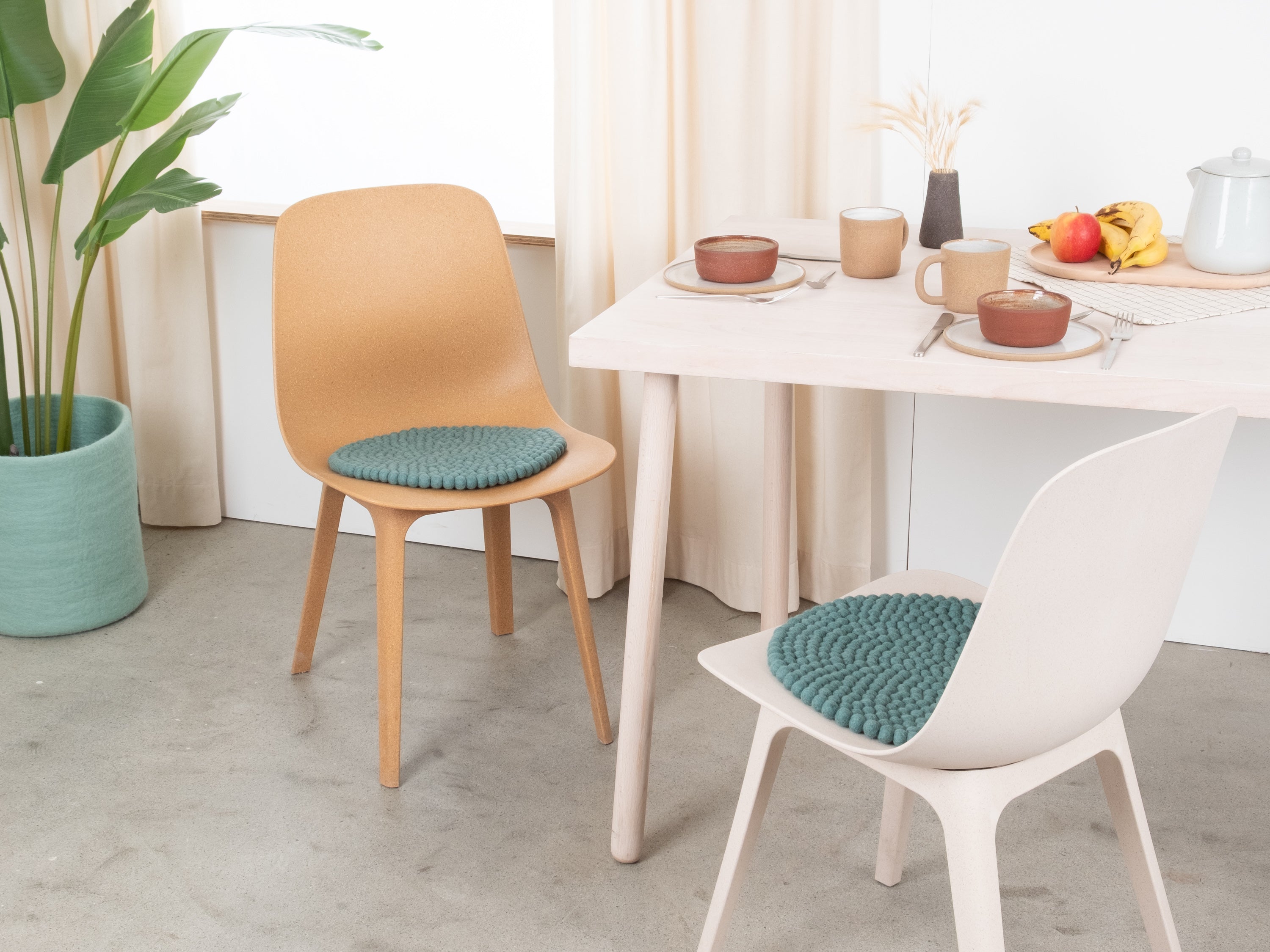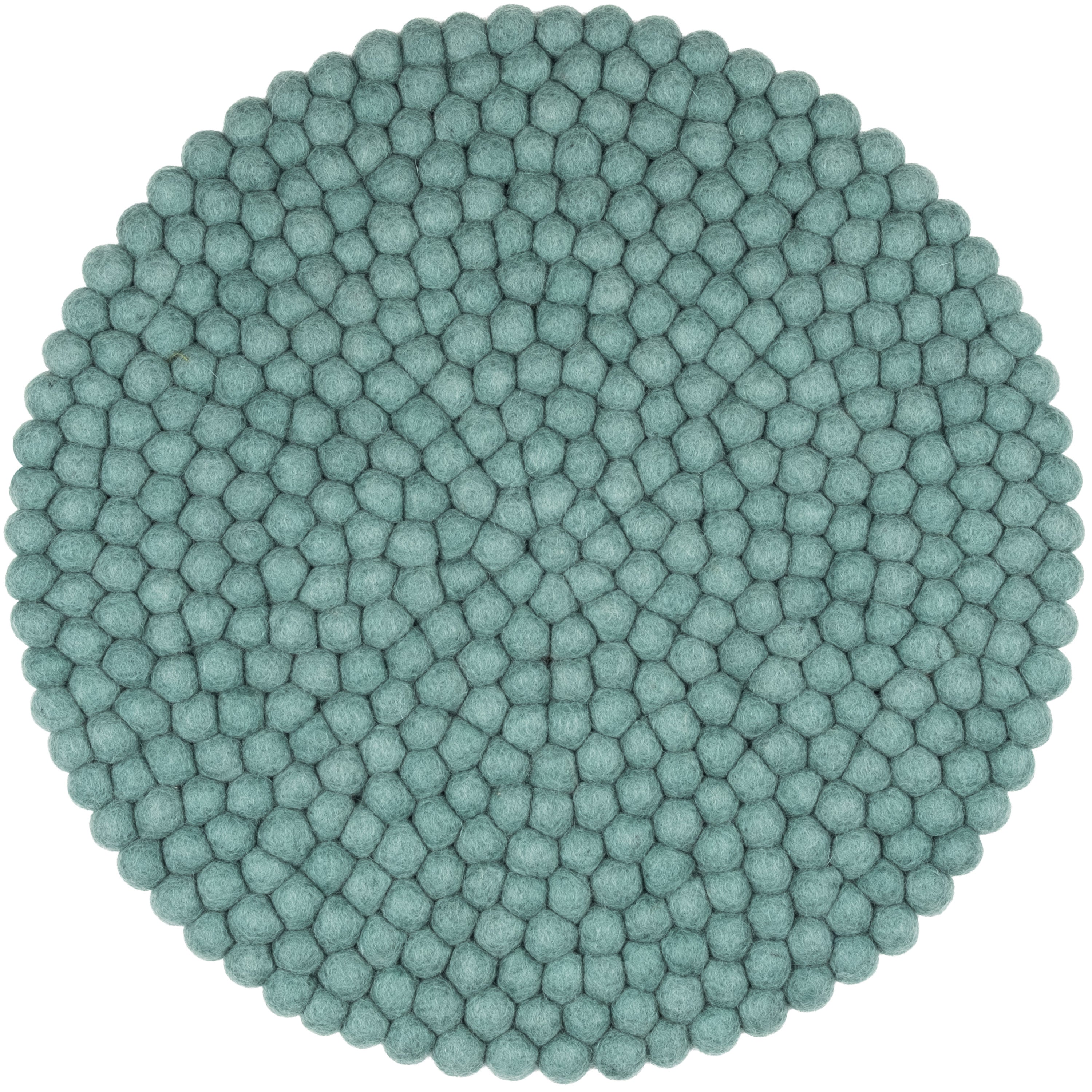 Runde, aquafarbene Sitzauflage aus reiner Schurwolle.