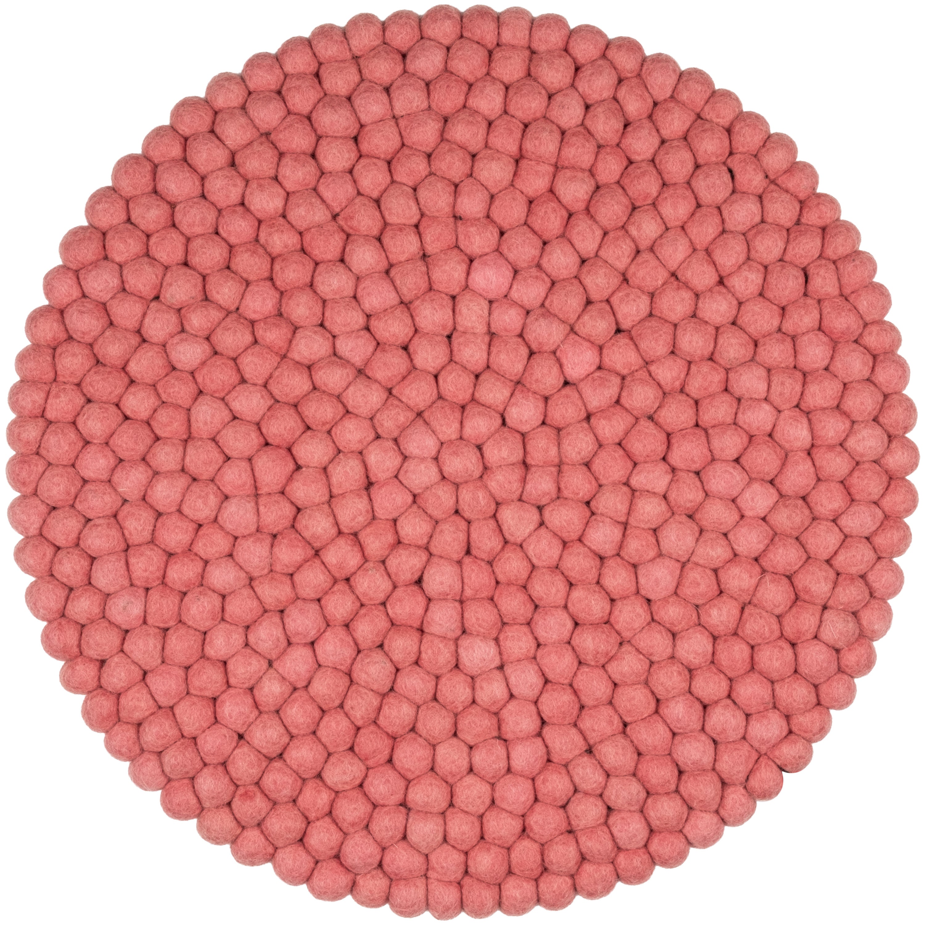 Runde, korallenrosa Sitzauflage aus reiner Schurwolle.