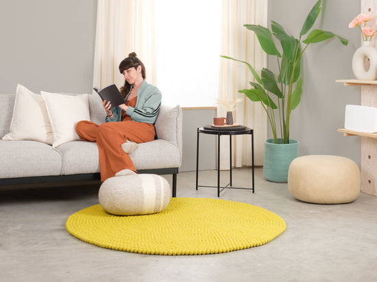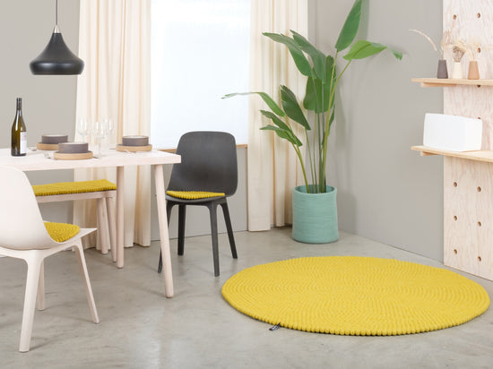 Kata ist ein Filzkugelteppich in frischem Gelbgrün. Leuchtend, vital und voller Energie bringt er Bewegung in den Raum. Ob als fröhlicher Akzent im Wohnzimmer oder als Lichtpunkt im Arbeitsbereich. Kata sorgt für Lebendigkeit und Leichtigkeit. Weich, robust und pflegeleicht. Handgefertigt in Nepal aus 100 % reiner Schurwolle.