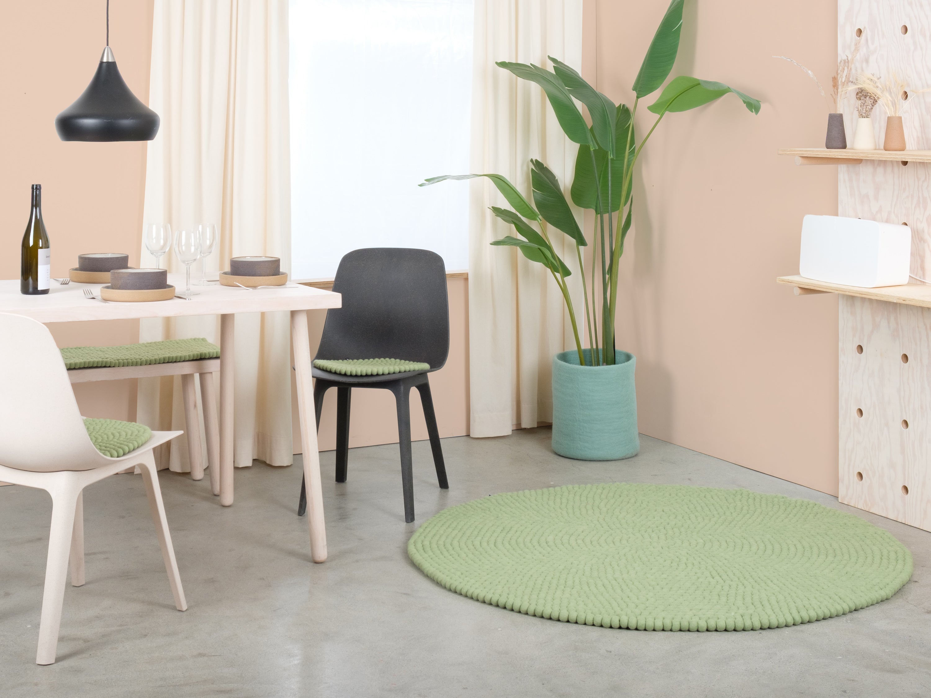 Runder Filzkugelteppich, hergestellt aus reiner Schurwolle.
