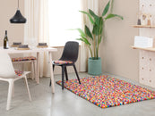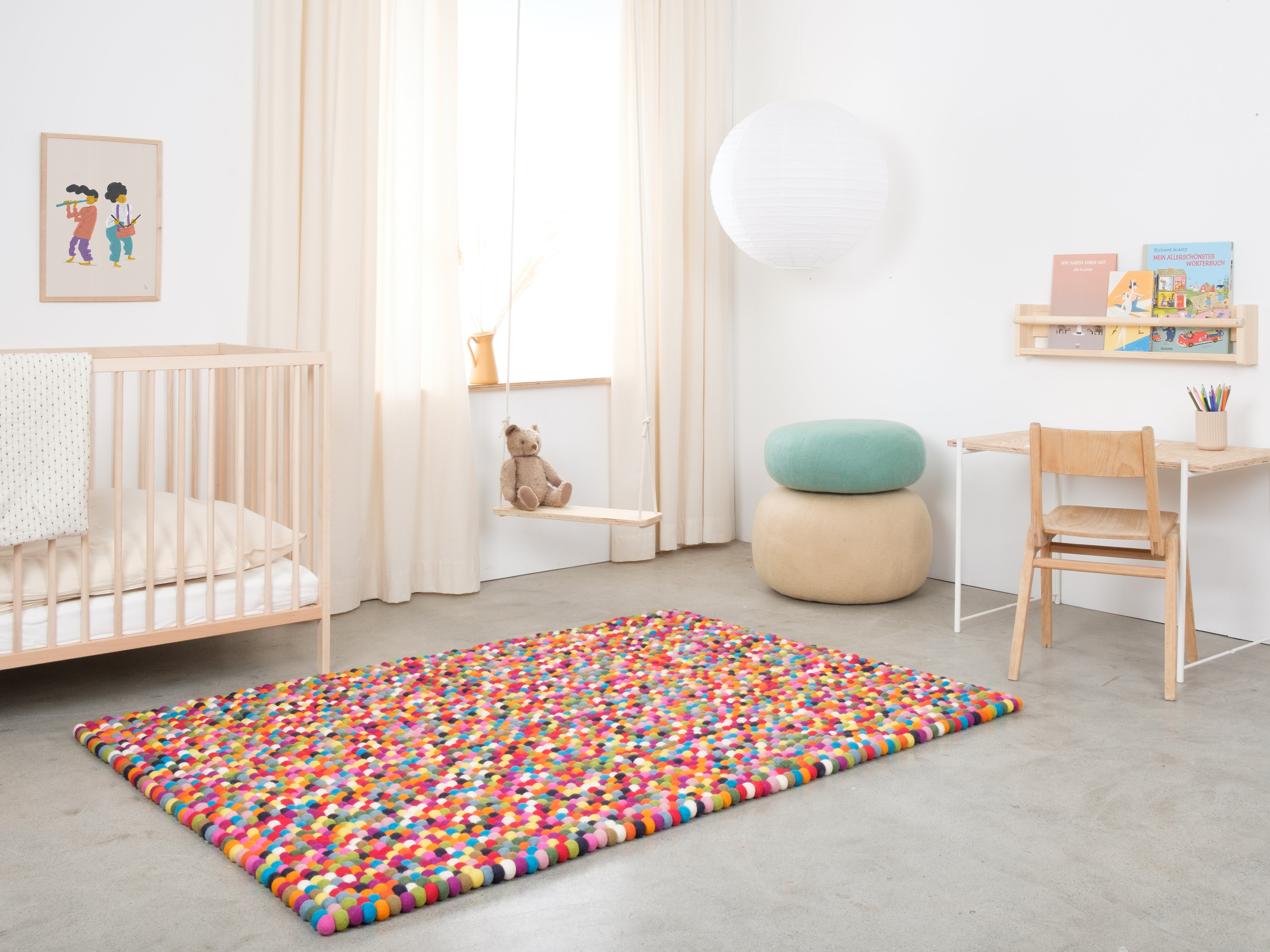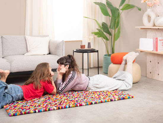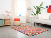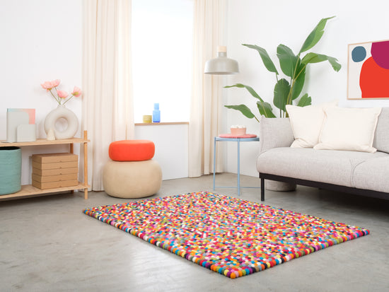 Rechteckiger, mehrfarbiger Filzkugelteppich hergestellt aus reiner Schurwolle.