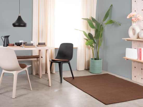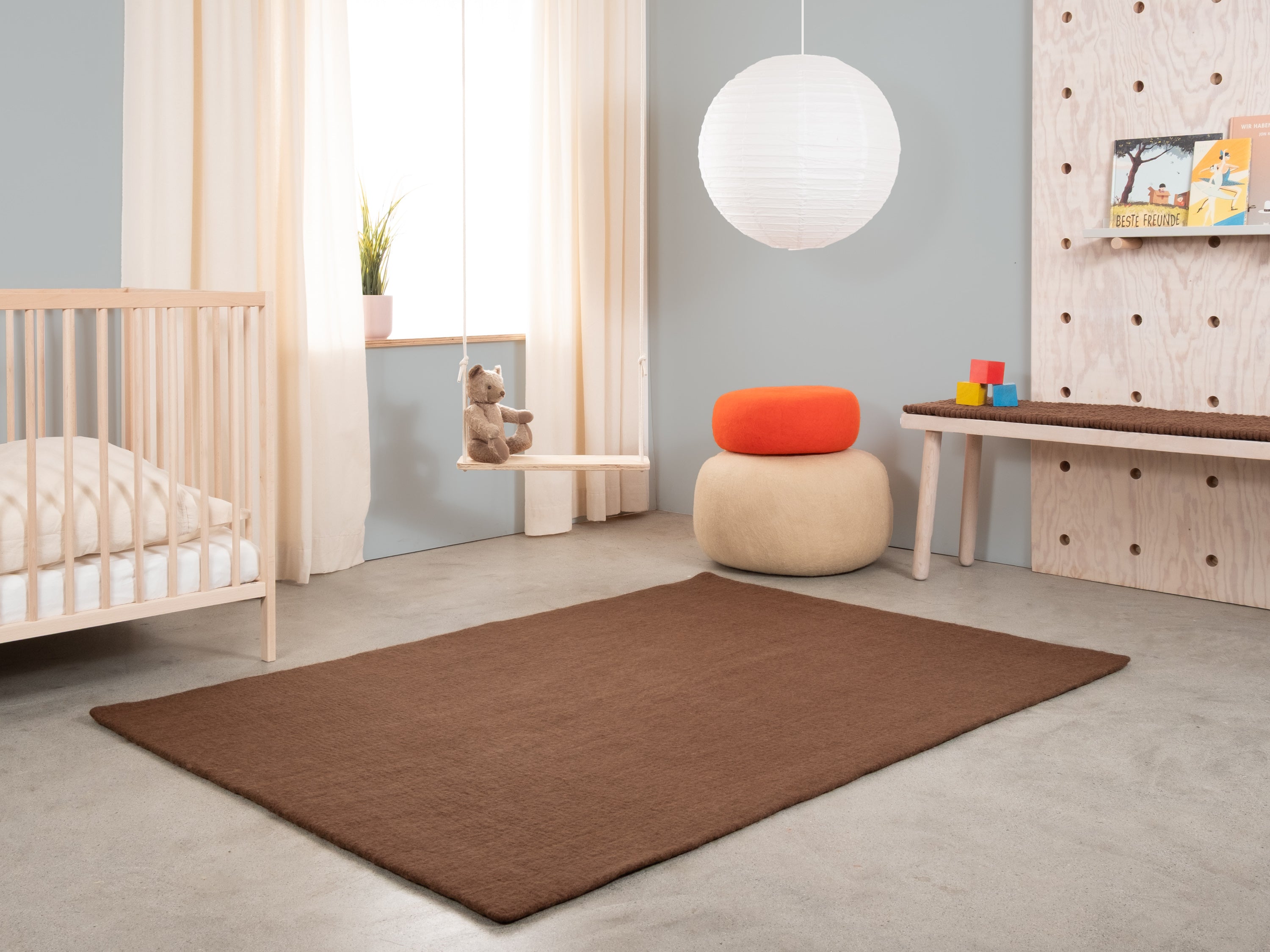 Egon setzt auf warmes Schokobraun. Der Filzteppich erdet jeden Raum, schafft Behaglichkeit und Struktur. Ideal für Leseecken und Wohnbereiche, die Wärme vertragen. Strapazierfähig, formstabil, angenehm unter den Füßen. Handarbeit aus Nepal – 100 % reine Schurwolle.