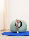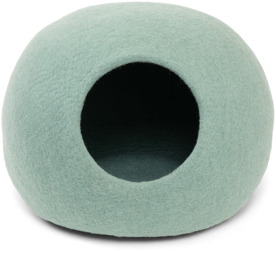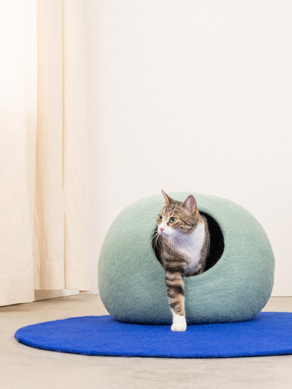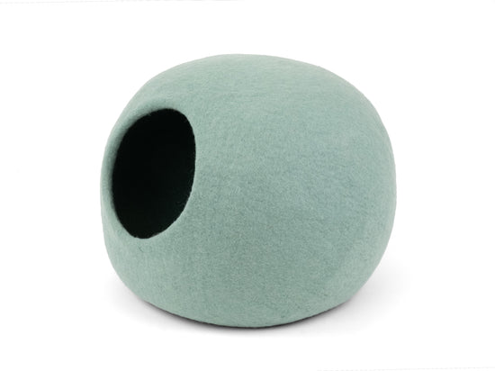Handgefertigte türkisfarbene Katzenhöhle aus 100% neuseeländischer Schurwolle.