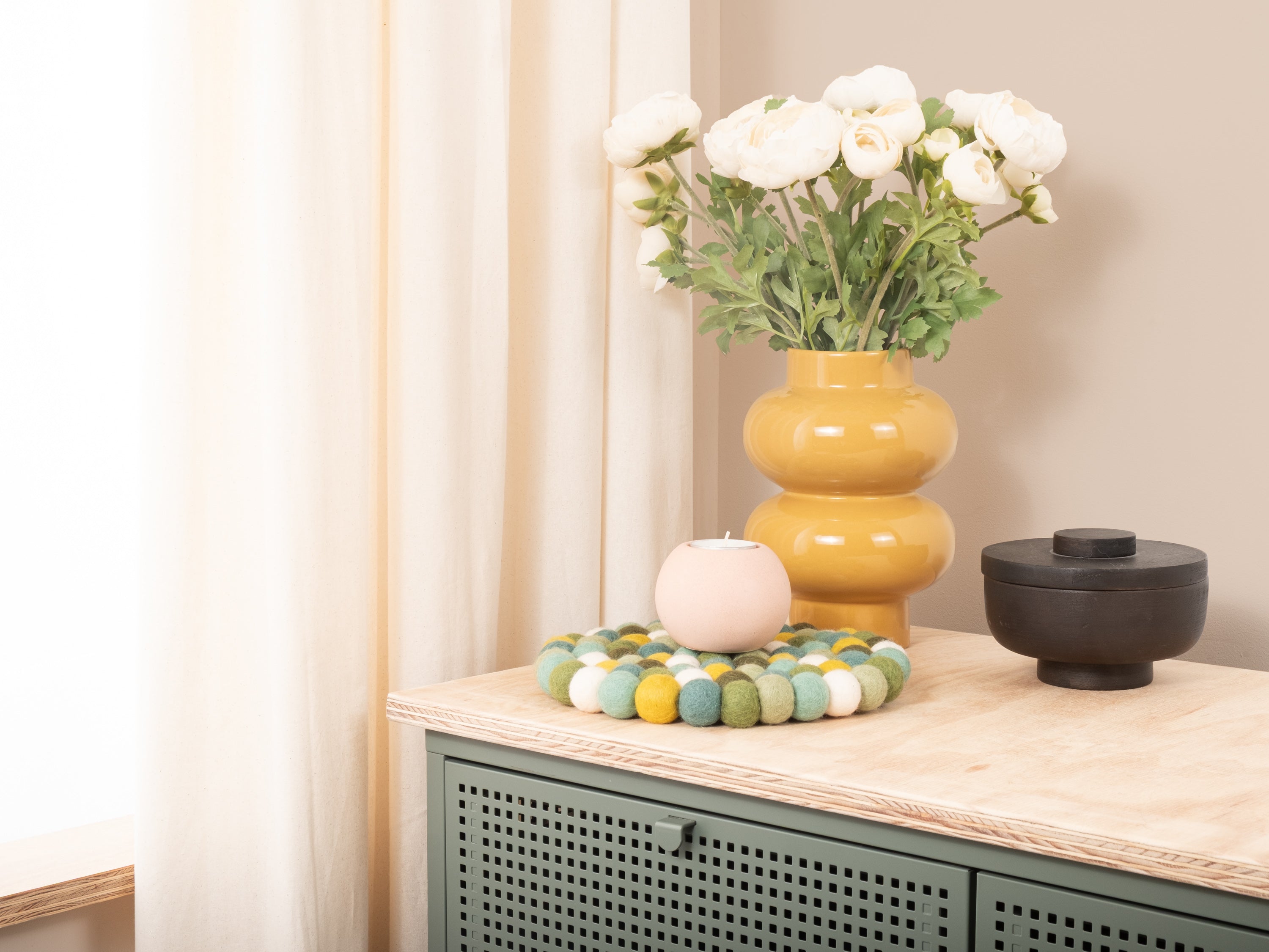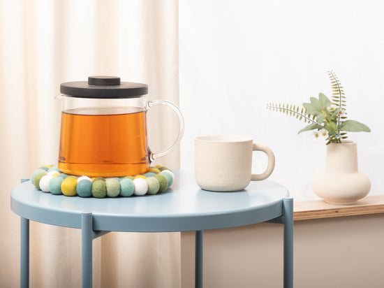 Der Topfuntersetzer Finn in den Farben Grün, Türkis und Weiß verbindet Funktion mit charmanter Optik. Robust, hitzebeständig, wasser- und schmutzabweisend sowie beidseitig verwendbar. Gefertigt aus reiner Schurwolle, von Hand in Nepal hergestellt und unter fairen Bedingungen produziert.