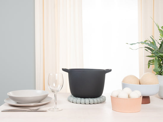 Der Topfuntersetzer Liv in der Farbe Hellblau verbindet Funktion mit charmanter Optik. Robust, hitzebeständig, wasser- und schmutzabweisend sowie beidseitig verwendbar. Gefertigt aus reiner Schurwolle, von Hand in Nepal hergestellt und unter fairen Bedingungen produziert.