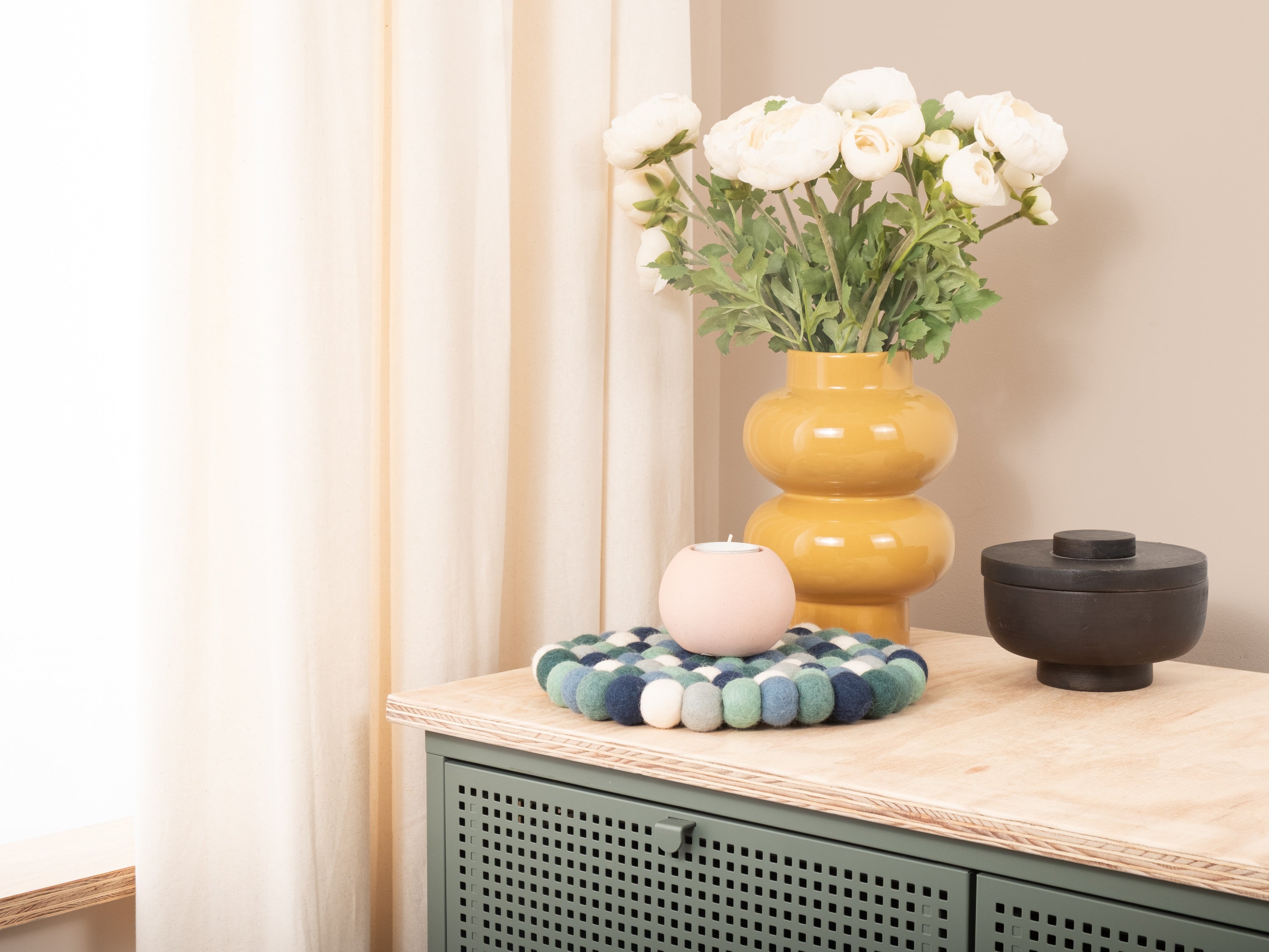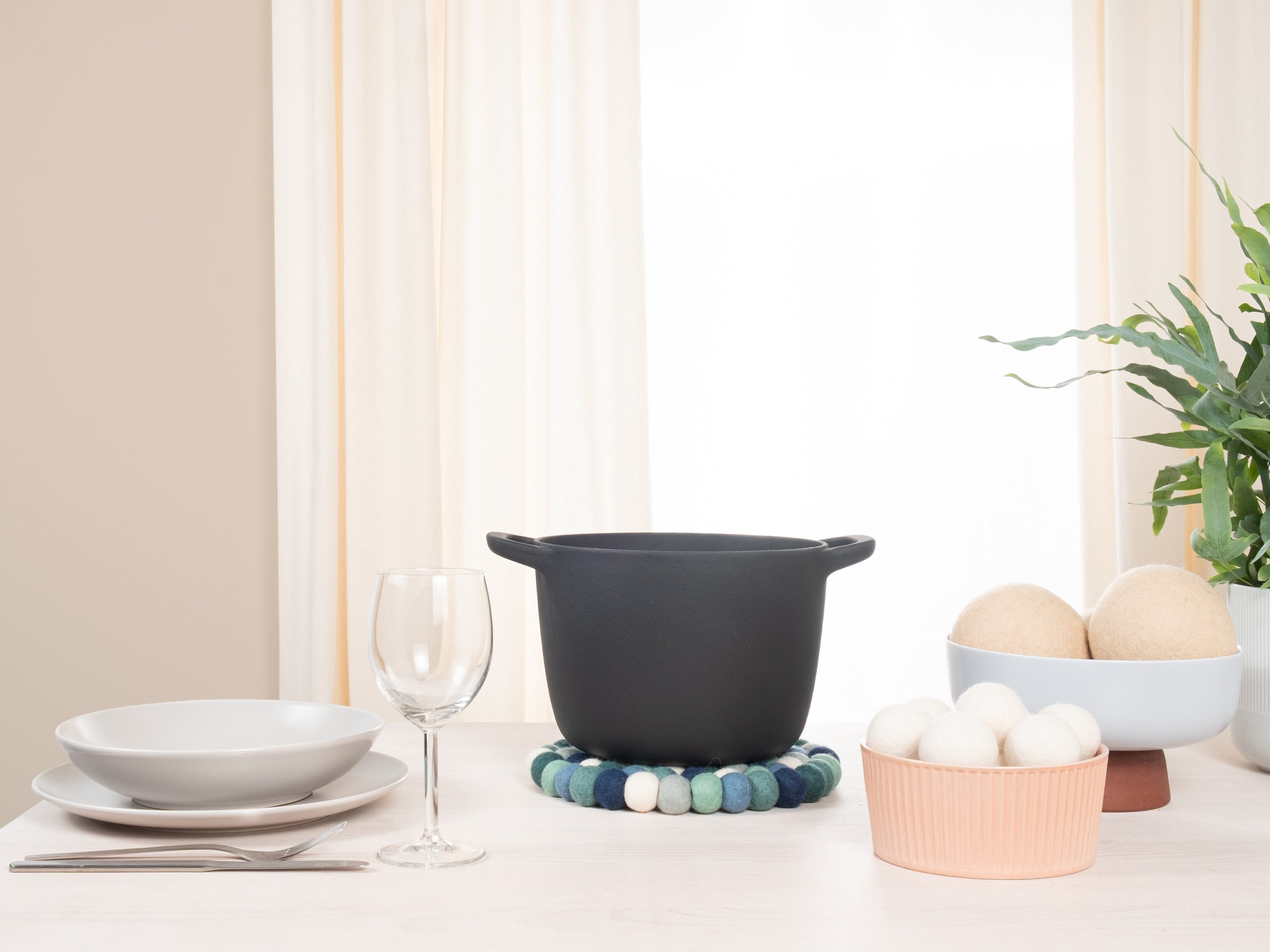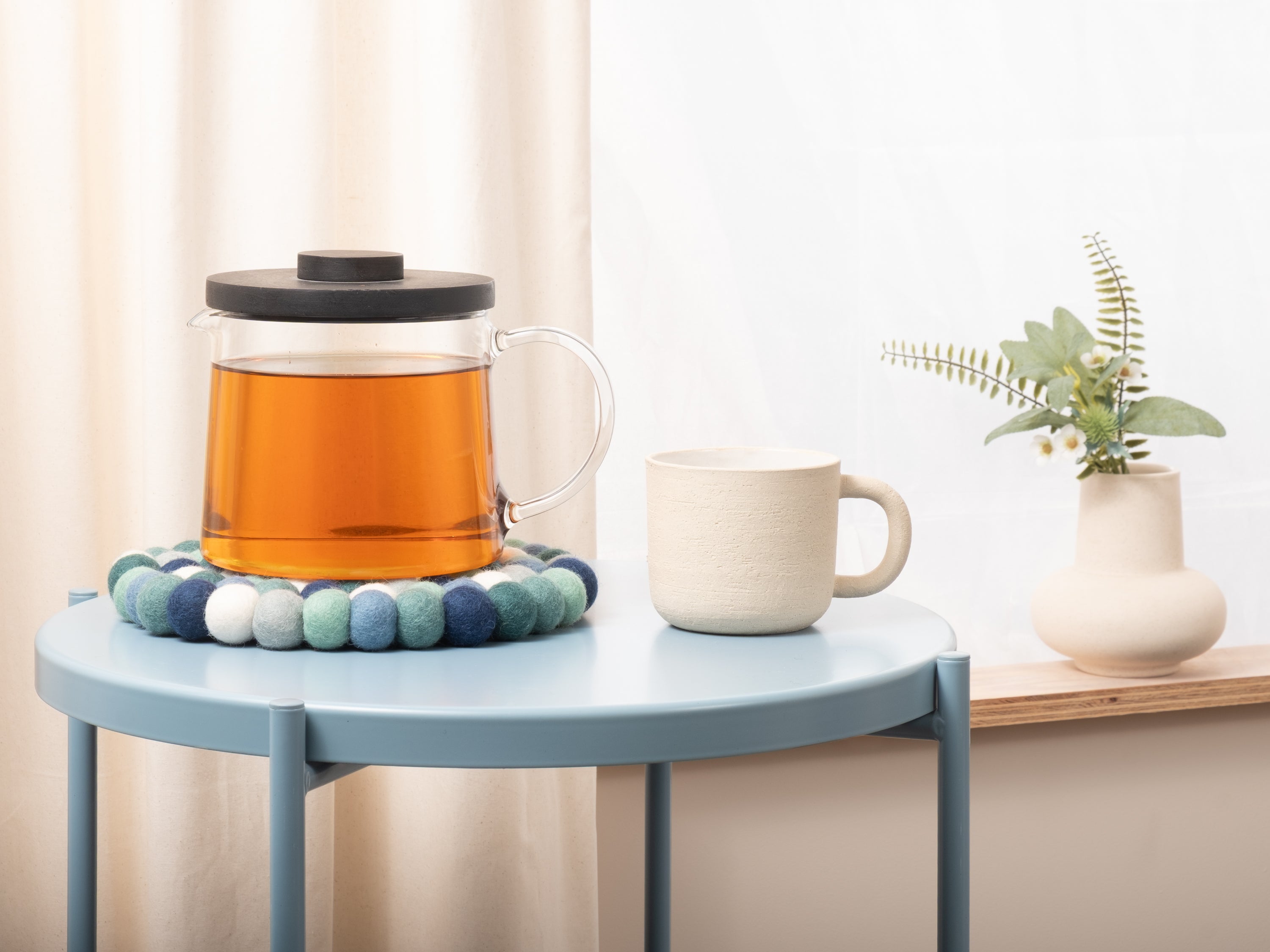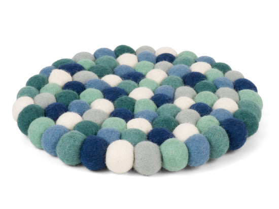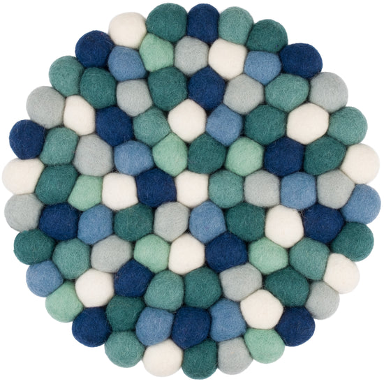 Der Topfuntersetzer Mare in den Farben Bla, Türkis und Weiß verbindet Funktion mit charmanter Optik. Robust, hitzebeständig, wasser- und schmutzabweisend sowie beidseitig verwendbar. Gefertigt aus reiner Schurwolle, von Hand in Nepal hergestellt und unter fairen Bedingungen produziert.