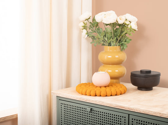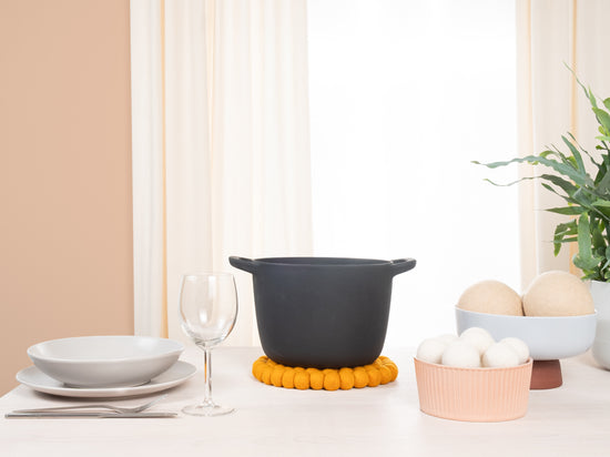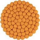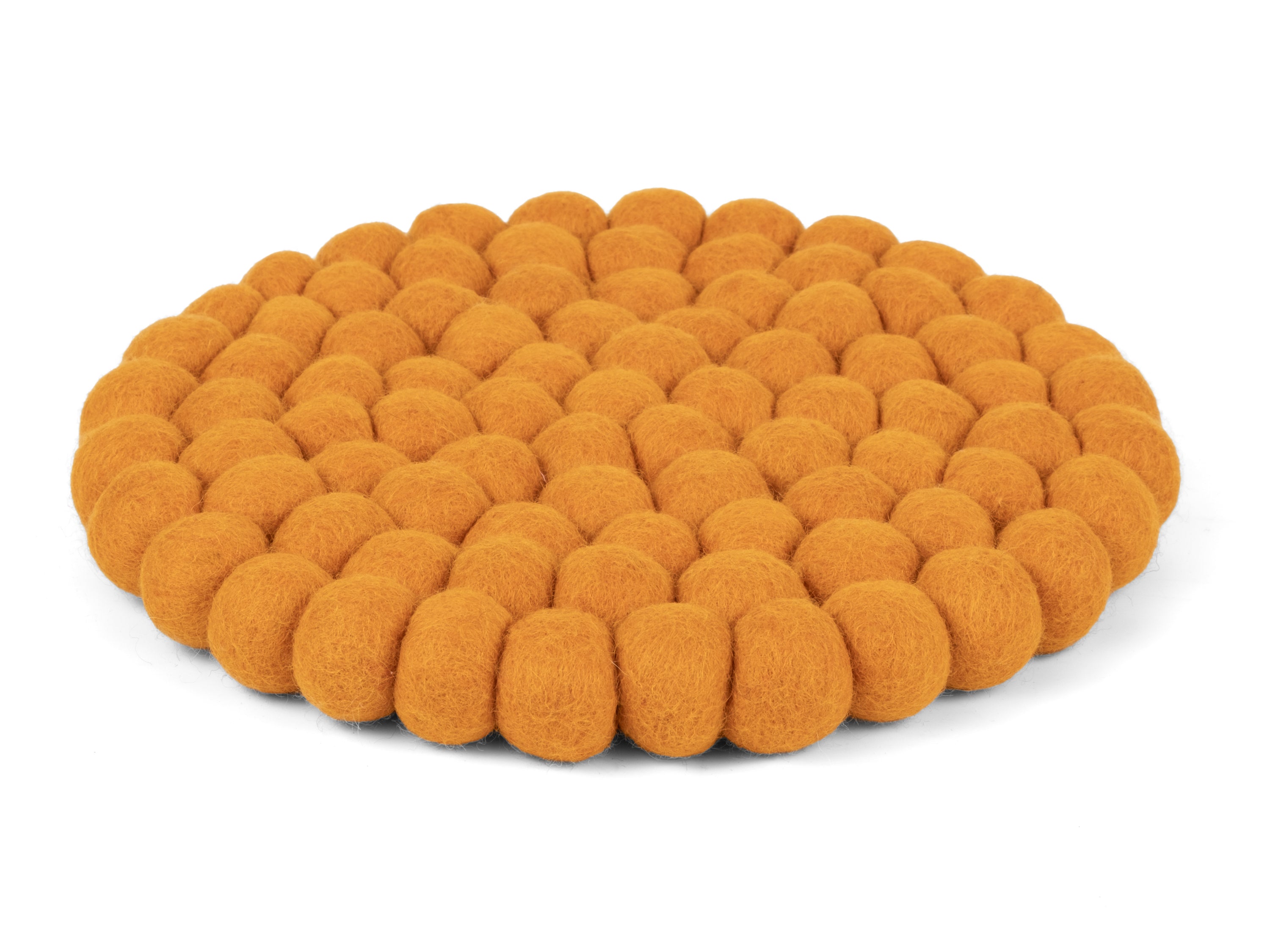 Runder, ockergelber Topfuntersetzer aus reiner Schurwolle